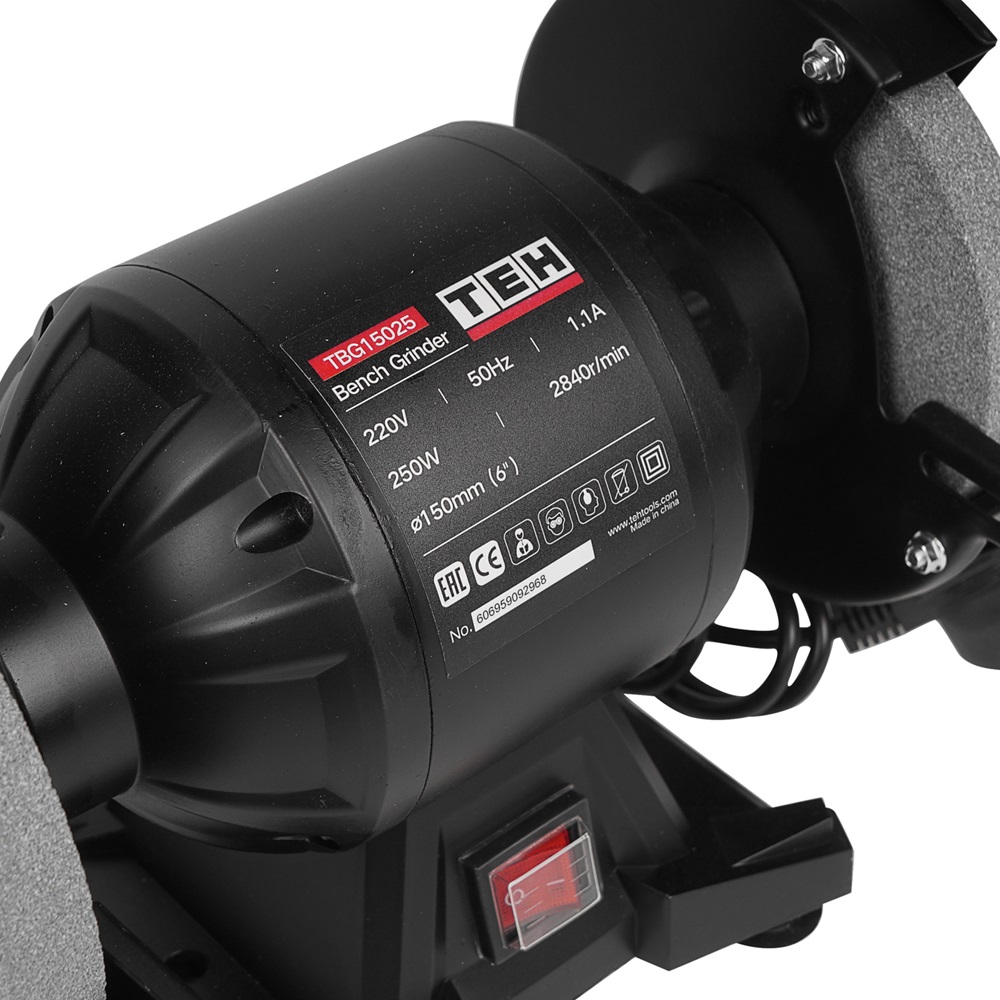 Точильный станок TEH TBG15025 предназначен для сухого шлифования металлических заготовок и затачивания режущего инструмента при помощи вертикально вращающихся заточных дисков.
