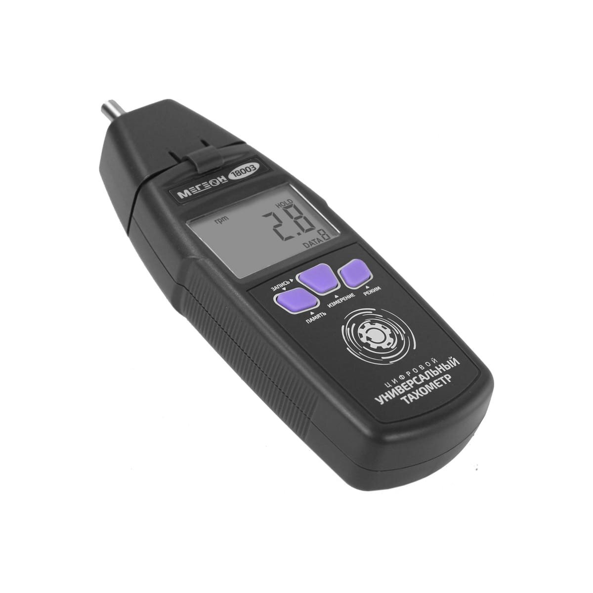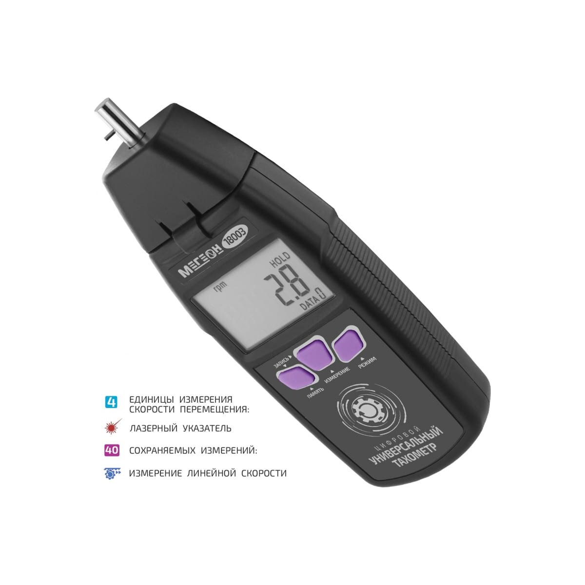 -Разрешение в режиме лазерного фототахометра: 0.1 об/мин (от 2.5 до 999.9 об/мин), 1 об/мин (свыше 1000 об/мин);