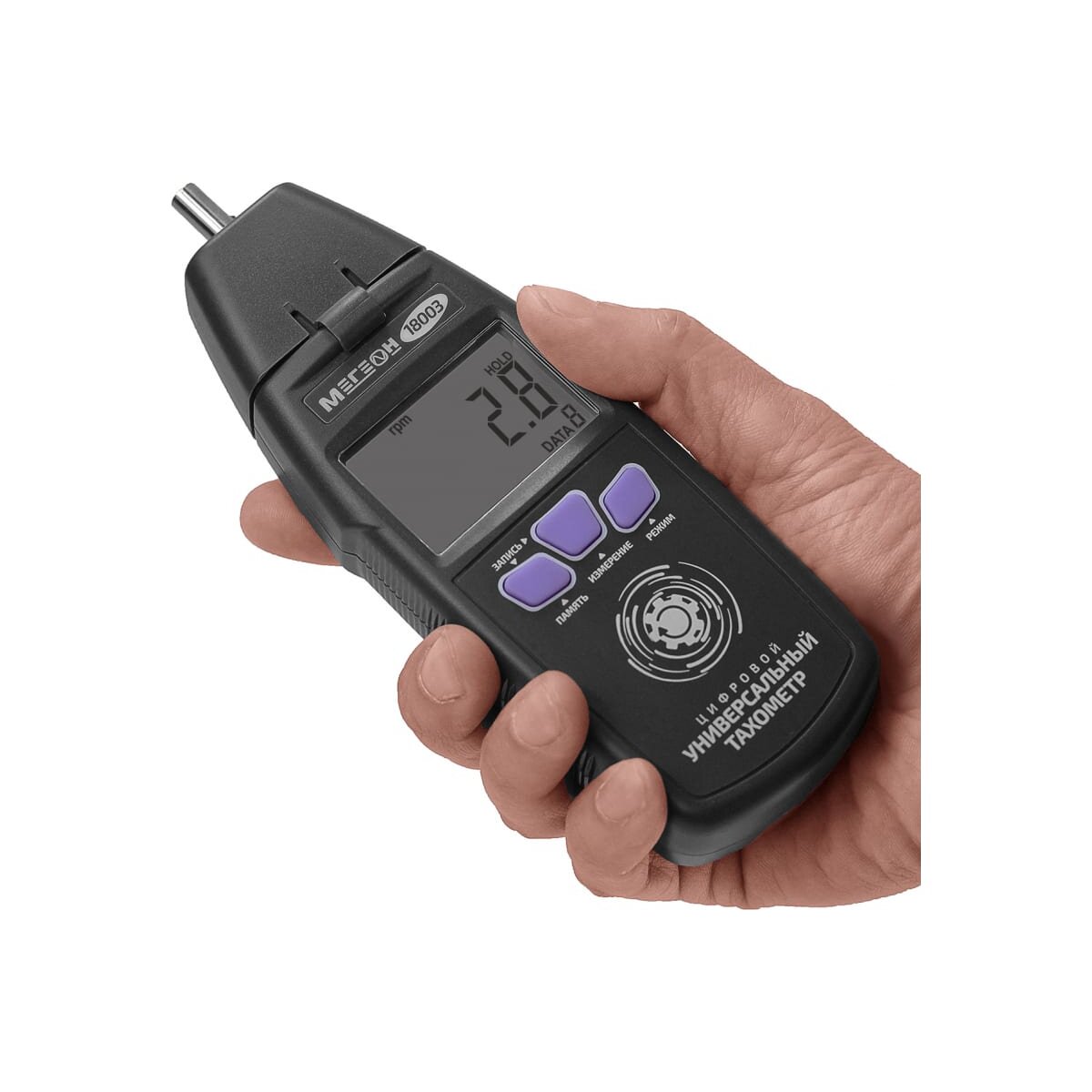 -Разрешение в режиме контактного тахометра: 0.1 об/мин (от 0.5 до 999.9 об/мин), 1 об/мин (свыше 1000 об/мин);