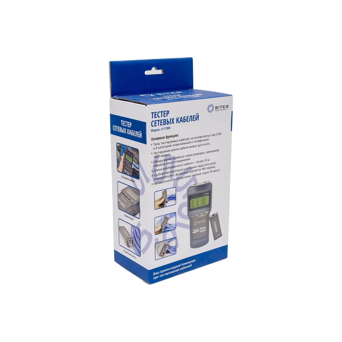 -Тип тестируемых кабелей: витая пара 5/5E и 6 категорий, коаксиальный и телефонный кабель (через адаптеры BNC/RJ11, в комплект не входят)