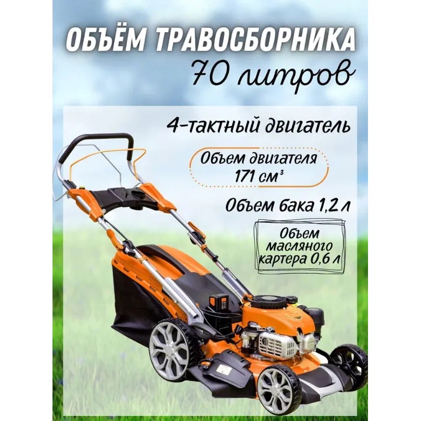 Общие характеристикиТип газонокосилисамоходнаяШирина скашивания51 смРекомендуемая площадь скашивания1000 кв.мСкорость вращения ножадо 6500 об./минТравосборникмягкий с жестким верхом, объем 70 лФункциональностьДополнительные функцииантивибрационная система, плавная регулировка скорости движения, регулировка высоты скашиванияКонструктивные особенностирегулировка ручки по высоте, складная ручкаМинимальная высота скашивания30 ммМаксимальная высота скашивания80 ммТравосборникмягкий с жестким верхомСистема выбросакомбинированныйДвигательДвигательбензиновыйКоличество тактов двигателя4х тактныйМощность ДВС5.5 л.с.Рабочий объем171 куб.смОбороты двигателя6500Топливный бакна 1.2 лОбъем масла0.6 лКонструкцияМатериал декипластикМатериал корпусастальКоличество колесчетырехколесная