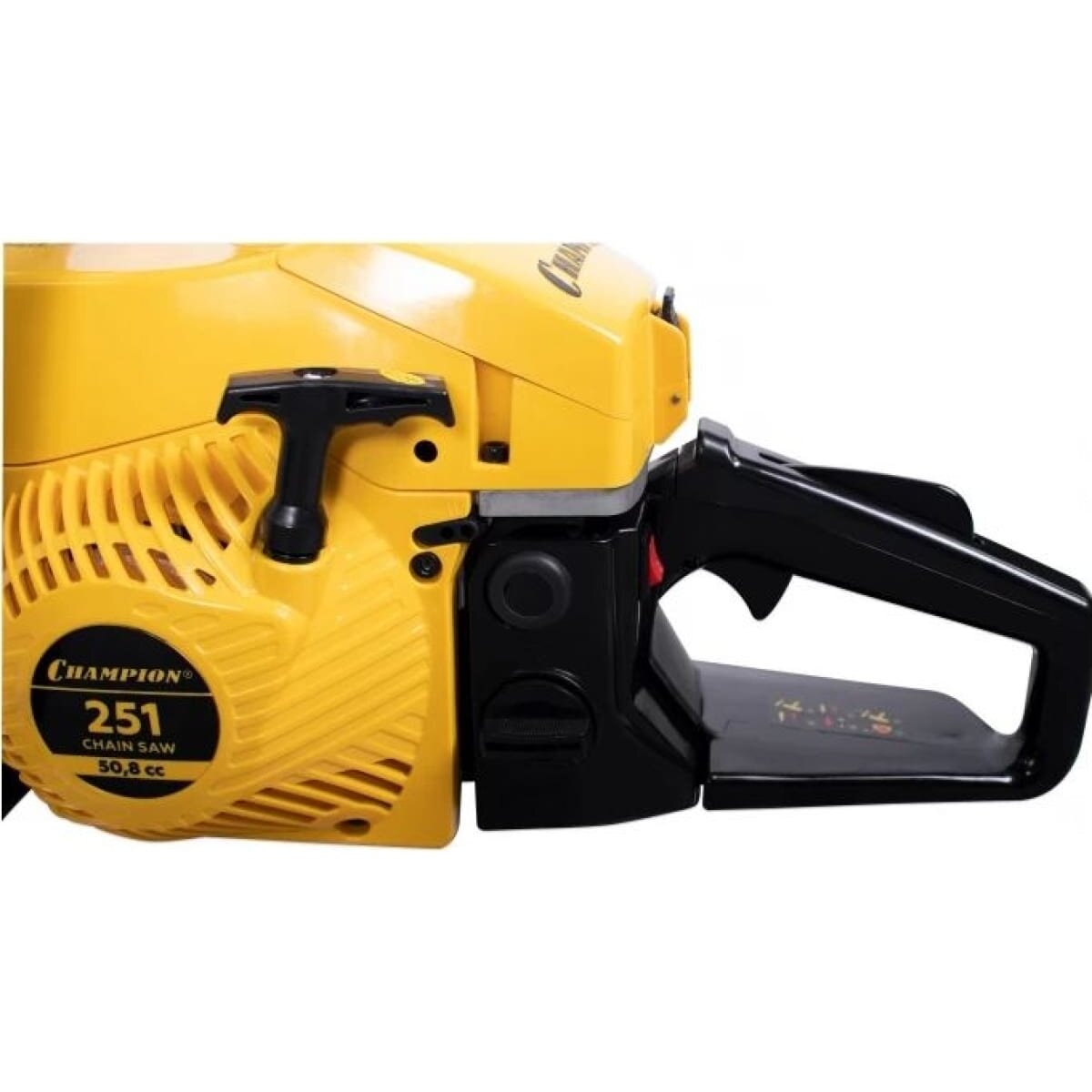 Бензопила Champion 251-15 – мощная бензиновая модель позиционируемая производителем как профессиональная. Мощность двухтактного мотора пилы составляет 3,13 лошадиные силы, а длинна полотна достигает 45 см. Натяжение цепи боковое, сама шина имеет четыре точки крепления ведомой звездочки. Стартер у пилы ручной с системой легкого запуска, упрощающей продергивание шнура кик стартера на 30%.