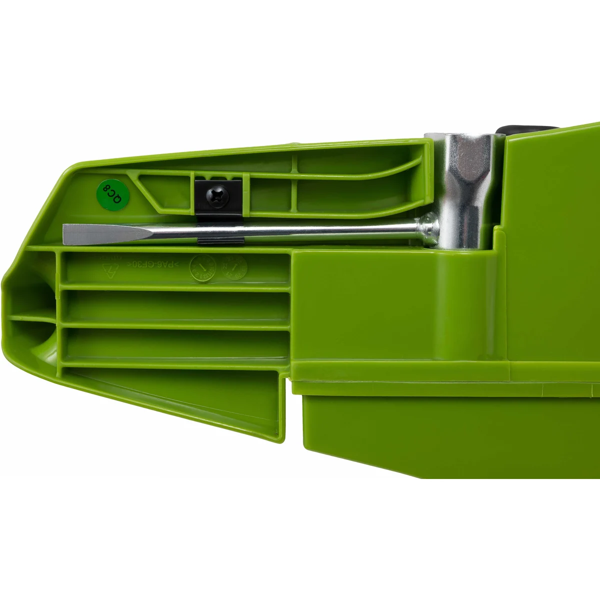 - Ключ для подтяжки цепи и замены свечи закрепляется в корпус.
