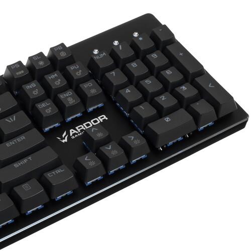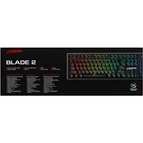 Клавиатура проводная ARDOR GAMING Blade 2 обладает клавишами, которые через специальное ПО настраиваются под игровые команды и определенные опции. С цифровым блоком не возникнет трудностей при обработке числовых данных. Главное звено модели – линейные переключатели Kailh Box Hush Pro. Они отличаются плавным и легким нажатием, уменьшая нагрузку на пальцы. RGB-подсветка обуславливает комфортную эксплуатацию ассистентки с наступлением сумерек. Кейкапы из пластика высокой жесткости не подвержены преждевременному истиранию символов.