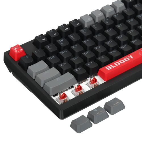 Клавиатура проводная+беспроводная A4Tech Bloody WS98 черного цвета является полноразмерной и механической. Подойдет для любителей играть в видеоигры. Она имеет RGB подсветку клавиш, цвет которой можно легко поменять. Шумоизоляция корпуса позволяет снизить шум от нажатия клавиш. Модель может работать удаленно через Bluetooth или радиоканал.