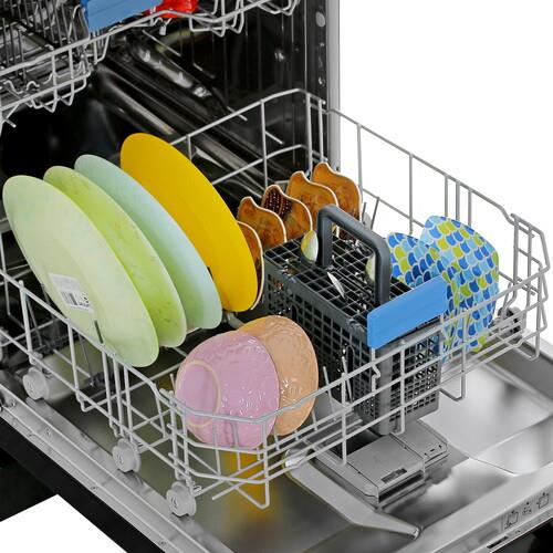Beko BDFN25521B имеет ширину 60 см. Три корзины позволяют разместить до 15 комплектов посуды за один раз. Верхняя корзина регулируется по высоте. Это удобно для размещения крупногабаритных предметов.
