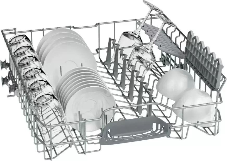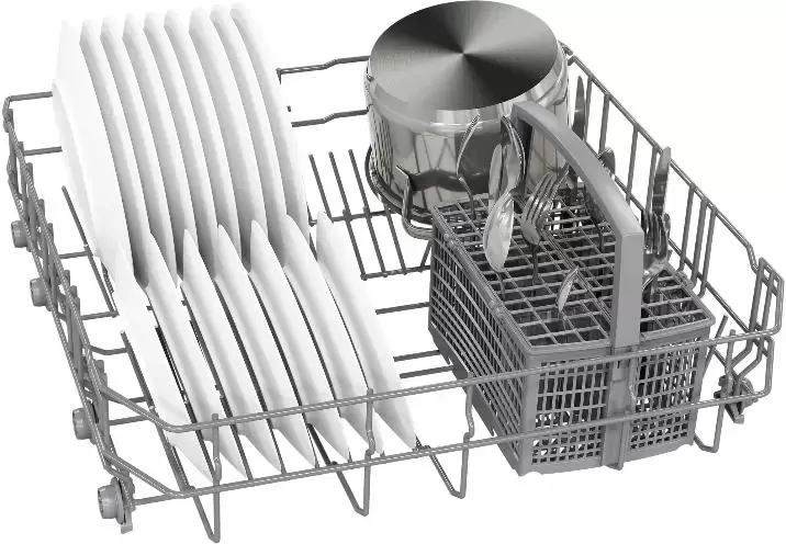 • Корзина для столовых приборов, полочка для чашек в верхнем коробе и направляющие для тарелок в нижнем коробе обеспечивают удобное размещение посуды.