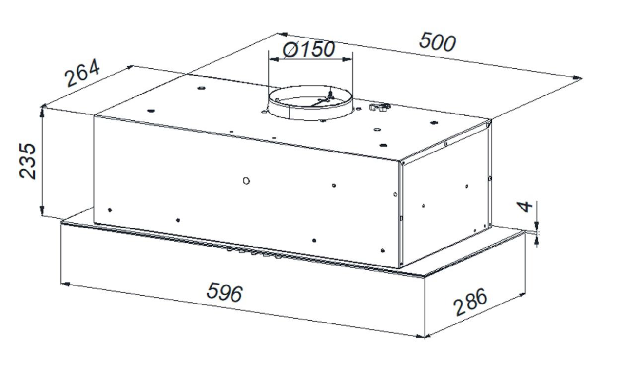 Weissgauff Aura 900 BL легко встраивается в кухонный шкаф. Габариты встраивания: ширина 50 см, минимальная высота 23.5 см, глубина 26.4 см. Установка над электрической плитой: минимум 65 см. Установка над газовой плитой: минимум 75 см. Диаметр воздуховода составляет 15 см.