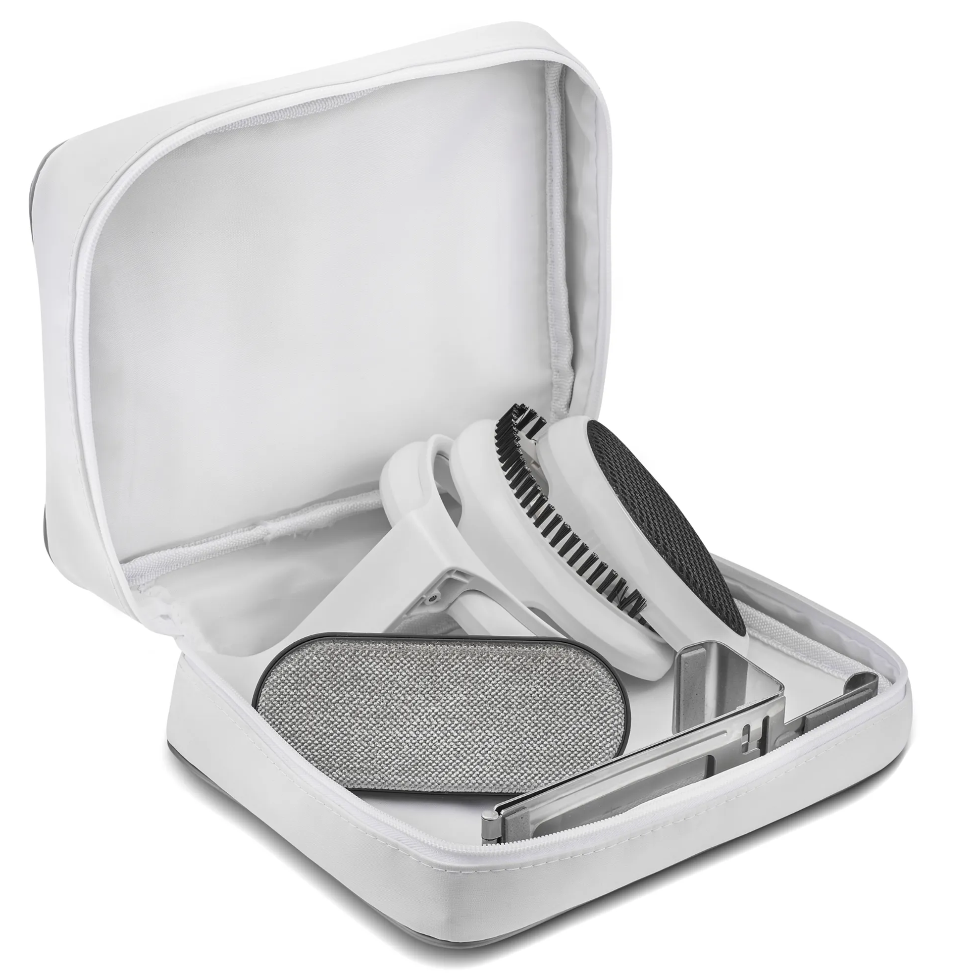 Щетка для плотной ткани, насадка для отпаривания деликатных тканей, насадка для создания стрелок, крючок для двери, насадка для удаления шерсти и пыли, чехол для хранения, вертикальная поддержка