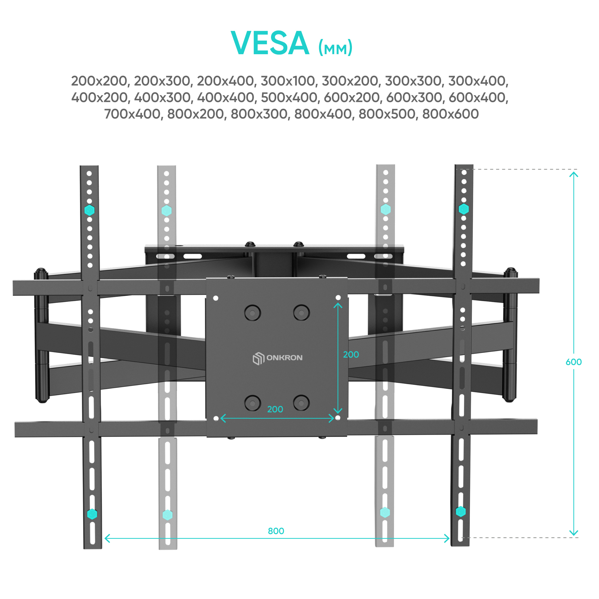 VESA: 200х200, 300x300, 400x200, макс. 400x400, макс. 600x400, макс. 800x500