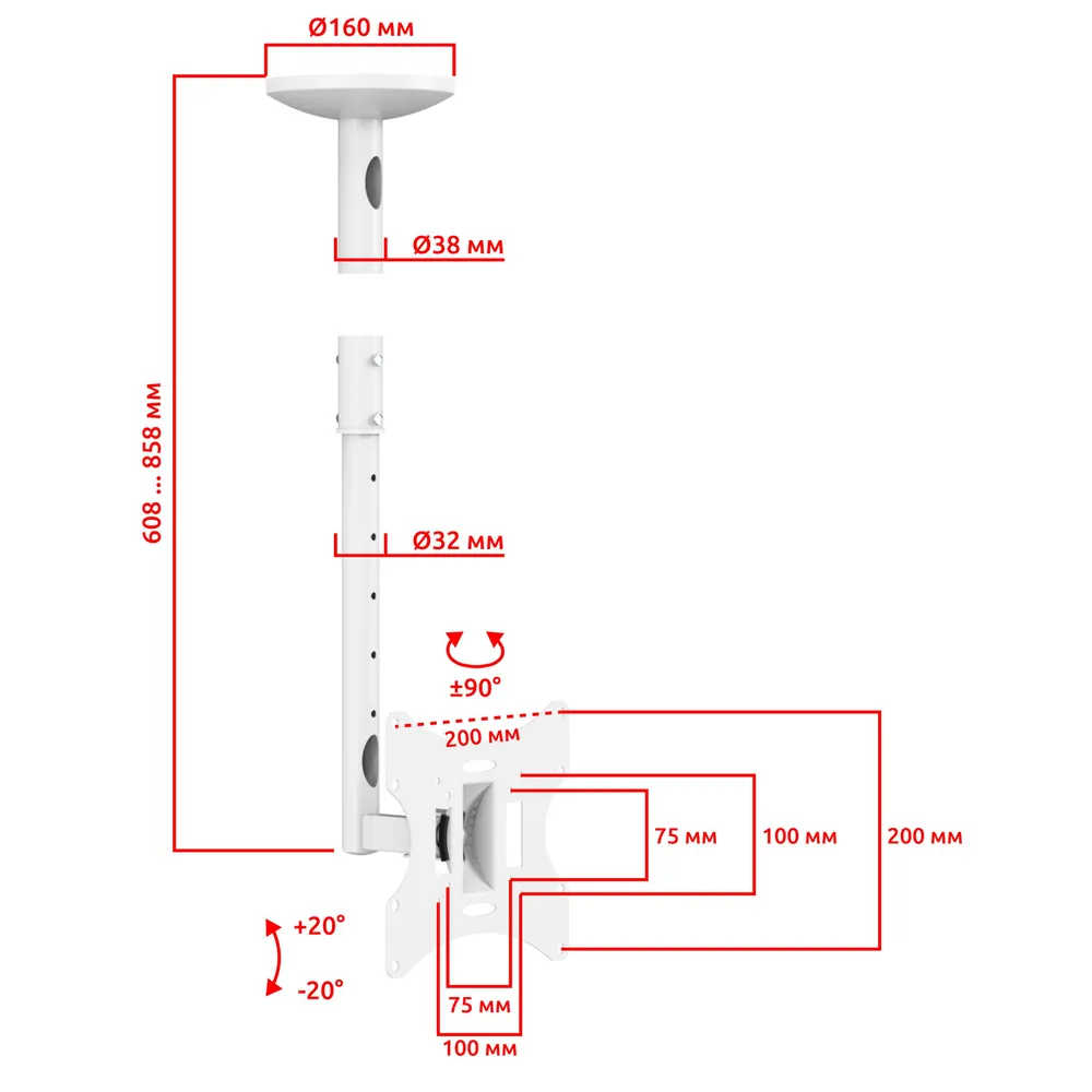 Кронштейн для телевизора или монитора на потолок наклонно поворотный, телескопический UNITEKI LCD2101NW белый диагональ 23-43 дюйма, крепление для монитора