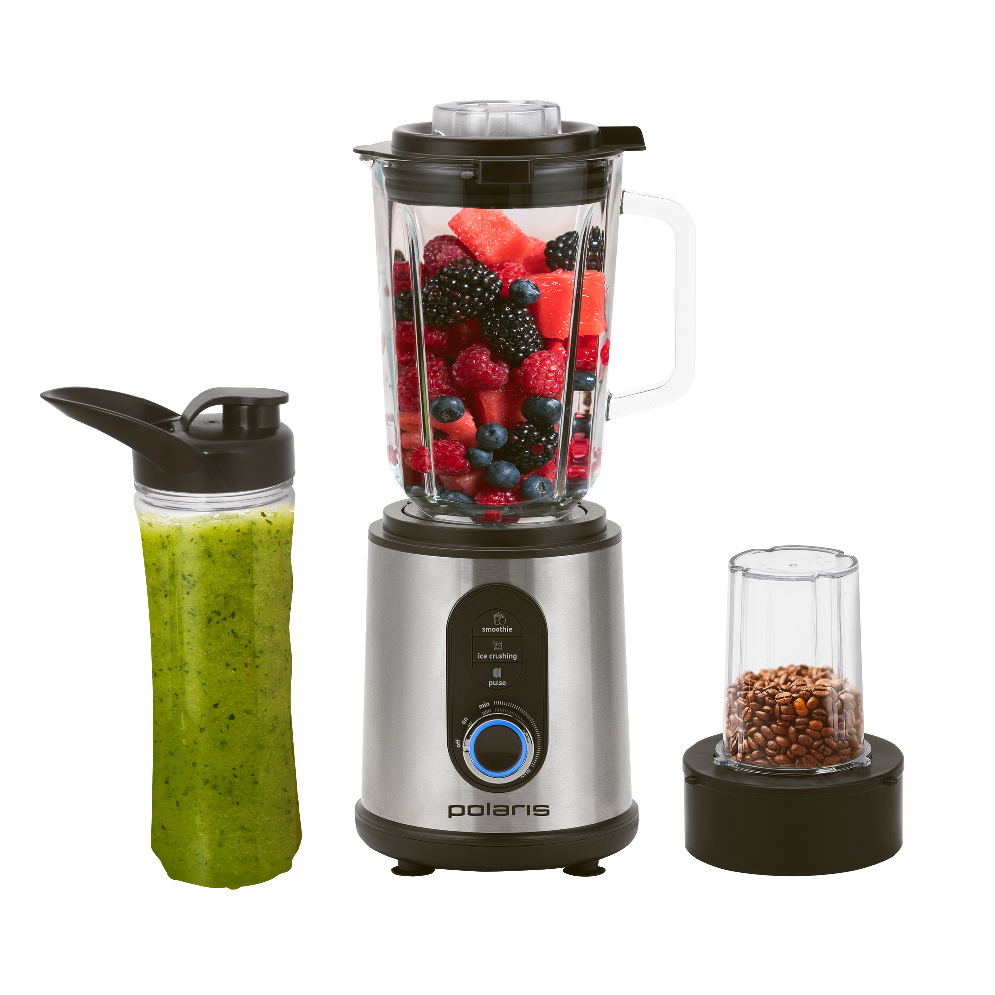 Другие насадки Съемный кувшин из высокопрочного стекла объемом 2 л (полезный объём 1,5 л). Компактный мини-измельчитель для перемалывания зёрен кофе, приготовления небольших порций соусов, дробления орехов, измельчения пряных трав и овощей.
