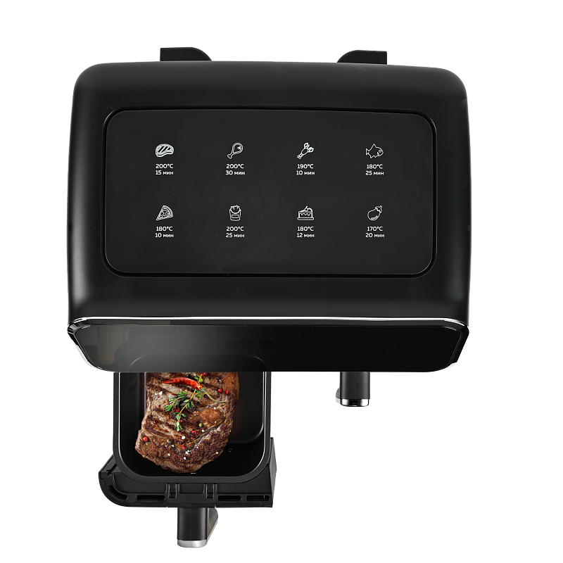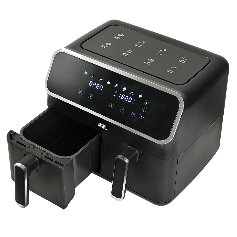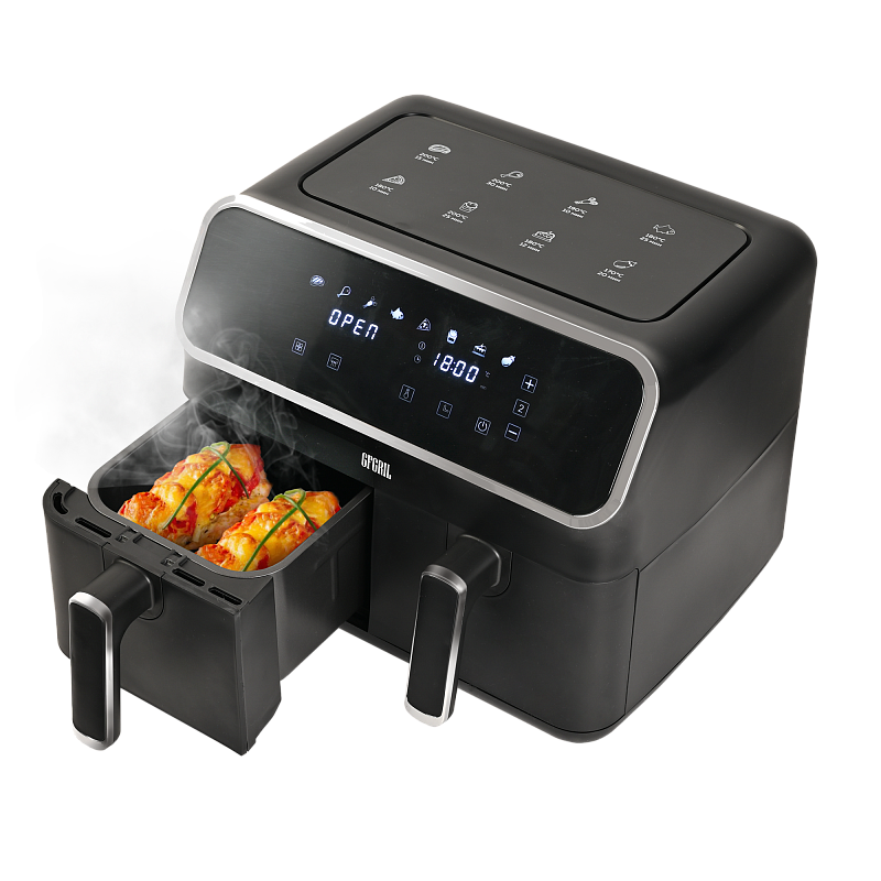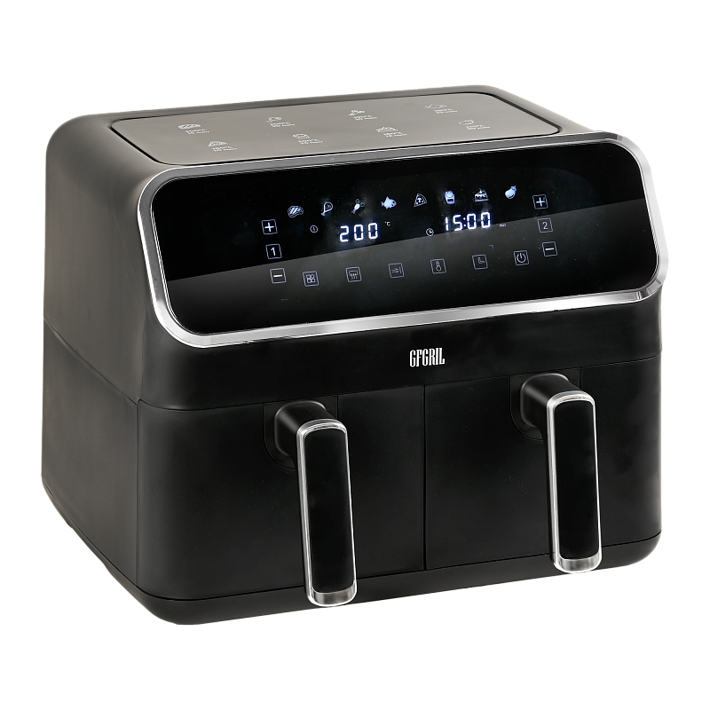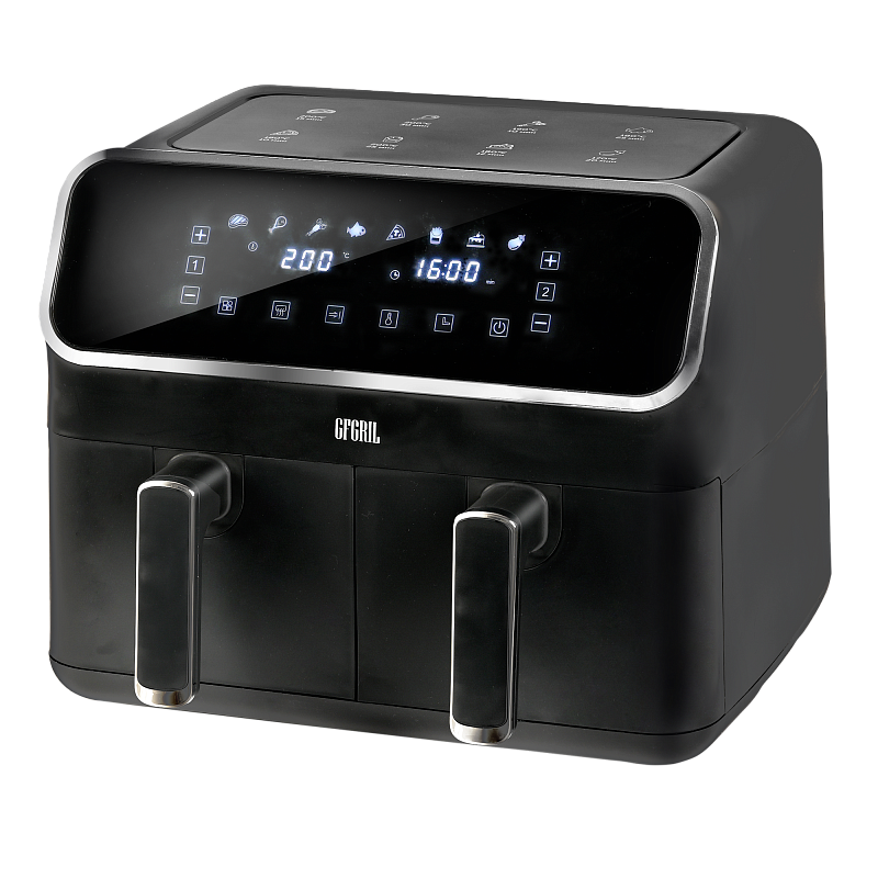 Многофункциональный аэрогриль с двумя чашами GFA-8000 – это универсальное устройство для тех, кто не хочет тратить много времени на приготовление пищи, но хочет питаться вкусно и полезно. Электрический аэрогриль GFA-8000 заменит сразу несколько бытовых приборов, таких как мини-печь, электрический гриль, фритюрница, духовка, СВЧ, дегидратор. А благодаря 2м чашам по 4 л каждая, Вы сможете приготовить несколько блюд одновременно - курицу гриль, стейки, морепродукты, большую порцию картофеля фри или другого гарнира, приготовить выпечку или другие разнообразные блюда для всей семьи.Гриль электрический обладает уникальной технологией циркуляции горячего воздуха на 360°, что позволяет сократить использование жира и масла на 90%. Продукты, приготовленные в аэрогриле, содержат в 1,5 раза меньше жиров, чем запеченные в духовке, и в 2,5 раза меньше, чем приготовленные на сковороде. Благодаря двум отдельным чашам запахи блюд не смешиваются, и вы сможете одновременно приготовить рыбу и мясо, а также полноценный обед или ужин из двух разных блюд. Продукты в аэрогриле практически не пригорают, пропекаются быстро и равномерно, сохраняют больше полезных питательных веществ, а также приобретают аппетитную хрустящую корочку. Процесс приготовления не требует Вашего постоянного присутствия – это обеспечивается за счет уникальной конструкции аэрогриля и предустановленным программам приготовления.Аэрофритюрница имеет сенсорную панель, которая позволит Вам одним касанием выбрать одну из 8 автоматических программ. Программы устанавливаются отдельно для каждой чаши. Встроенный звуковой сигнал оповестит о готовности блюда. Также можно самостоятельно установить время от 1 до 60 минут и температуру приготовления от 80 до 200 °C для каждой чаши, при этом на дисплеях будет отображаться установленная температура и время, оставшееся до окончания приготовления. Электрический гриль аэро оснащен нагревательным элементом высокой мощности 2700 Вт и встроенным мощным вентилятором, которые обеспечивают быстрый нагрев аэрогриля от 80 до 200 °C, что позволит блюдам быстро и равномерно приготовиться со всех сторон.Мультипечь GFA-8000 выполнена в стильном черном корпусе с вставками из нержавейки и оборудована нескользящими ножками. Чаши прибора с высококачественным антипригарным покрытием избавят Вас от подгоревшей пищи и обеспечат легкий уход и очистку прибора. Приготовить полноценный обед или ужин из двух блюд при помощи GFA-8000 просто - достаточно загрузить продукты в чаши, подключить прибор к сети, выбрать одну из предустановленных программ приготовления и дождаться звукового сигнала, оповещающего о том, что Ваши блюда готовы.АртикулGFA-8000ТипАэрогриль 2 чашиМощность, Вт2700КомплектацияКорпус аэрогриля с 2мя чашамиРазмеры, мм390х385х310Вес товара, кг7.5Цвет товараЧерныйАвтопрограммы8Внутреннее покрытие чашиАнтипригарноеМатериал корпусаПластик+металлОбъём, л8Мин. температура, °С80Таймер, мин60Тип управленияСенсорноеОтложенный стартдаМакс. температура, °С200