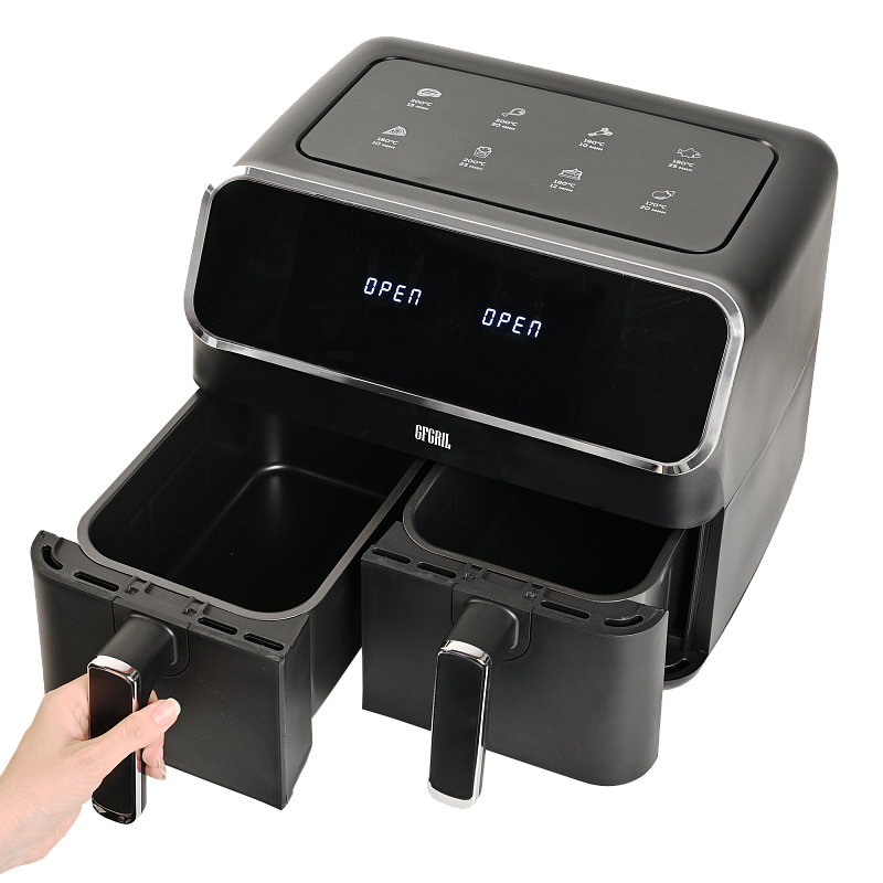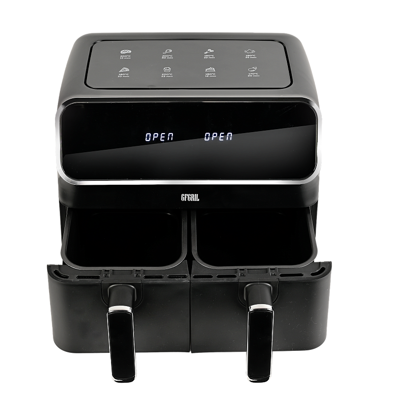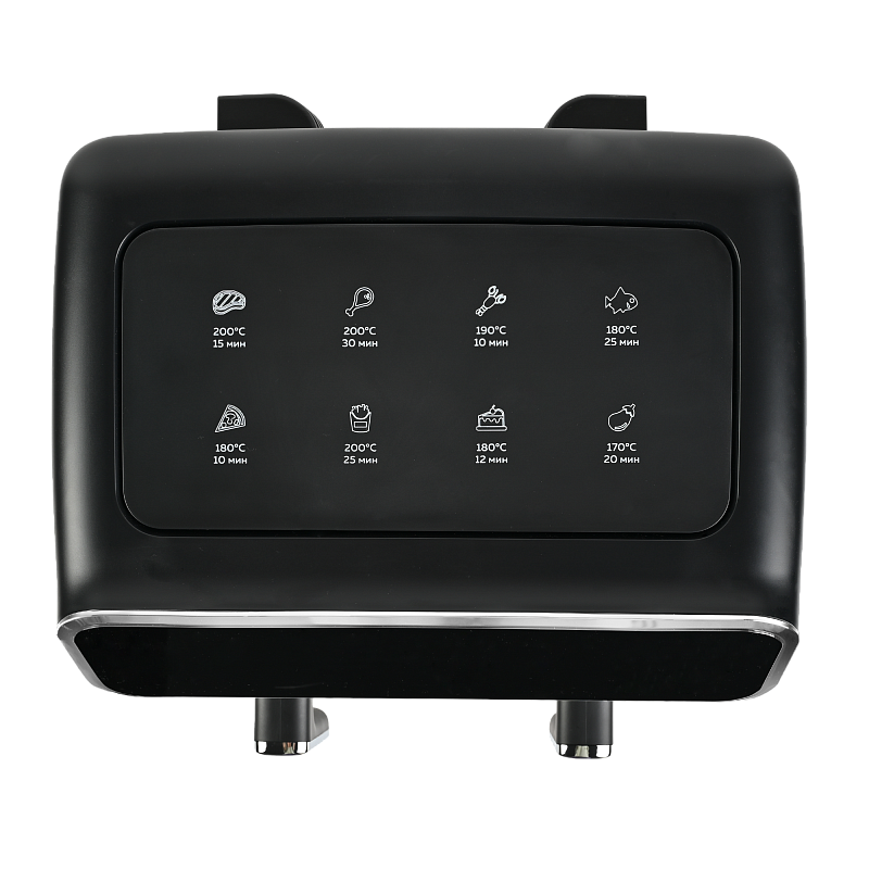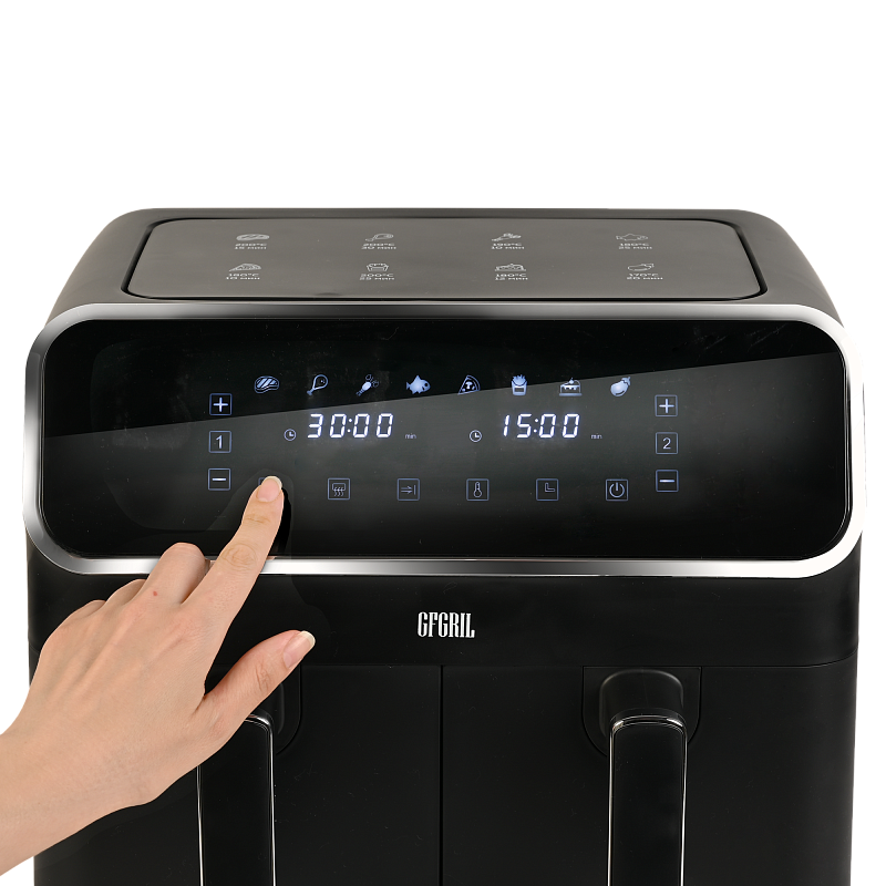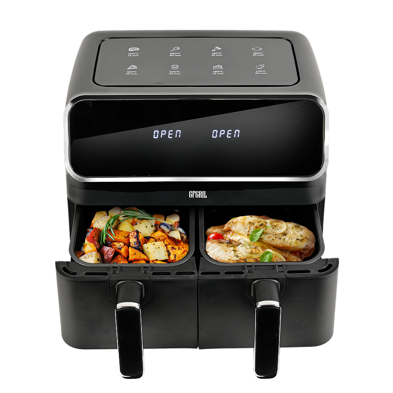 Многофункциональный аэрогриль с двумя чашами GFA-8000 – это универсальное устройство для тех, кто не хочет тратить много времени на приготовление пищи, но хочет питаться вкусно и полезно. Электрический аэрогриль GFA-8000 заменит сразу несколько бытовых приборов, таких как мини-печь, электрический гриль, фритюрница, духовка, СВЧ, дегидратор. А благодаря 2м чашам по 4 л каждая, Вы сможете приготовить несколько блюд одновременно - курицу гриль, стейки, морепродукты, большую порцию картофеля фри или другого гарнира, приготовить выпечку или другие разнообразные блюда для всей семьи.Гриль электрический обладает уникальной технологией циркуляции горячего воздуха на 360°, что позволяет сократить использование жира и масла на 90%. Продукты, приготовленные в аэрогриле, содержат в 1,5 раза меньше жиров, чем запеченные в духовке, и в 2,5 раза меньше, чем приготовленные на сковороде. Благодаря двум отдельным чашам запахи блюд не смешиваются, и вы сможете одновременно приготовить рыбу и мясо, а также полноценный обед или ужин из двух разных блюд. Продукты в аэрогриле практически не пригорают, пропекаются быстро и равномерно, сохраняют больше полезных питательных веществ, а также приобретают аппетитную хрустящую корочку. Процесс приготовления не требует Вашего постоянного присутствия – это обеспечивается за счет уникальной конструкции аэрогриля и предустановленным программам приготовления.Аэрофритюрница имеет сенсорную панель, которая позволит Вам одним касанием выбрать одну из 8 автоматических программ. Программы устанавливаются отдельно для каждой чаши. Встроенный звуковой сигнал оповестит о готовности блюда. Также можно самостоятельно установить время от 1 до 60 минут и температуру приготовления от 80 до 200 °C для каждой чаши, при этом на дисплеях будет отображаться установленная температура и время, оставшееся до окончания приготовления. Электрический гриль аэро оснащен нагревательным элементом высокой мощности 2700 Вт и встроенным мощным вентилятором, которые обеспечивают быстрый нагрев аэрогриля от 80 до 200 °C, что позволит блюдам быстро и равномерно приготовиться со всех сторон.Мультипечь GFA-8000 выполнена в стильном черном корпусе с вставками из нержавейки и оборудована нескользящими ножками. Чаши прибора с высококачественным антипригарным покрытием избавят Вас от подгоревшей пищи и обеспечат легкий уход и очистку прибора. Приготовить полноценный обед или ужин из двух блюд при помощи GFA-8000 просто - достаточно загрузить продукты в чаши, подключить прибор к сети, выбрать одну из предустановленных программ приготовления и дождаться звукового сигнала, оповещающего о том, что Ваши блюда готовы.АртикулGFA-8000ТипАэрогриль 2 чашиМощность, Вт2700КомплектацияКорпус аэрогриля с 2мя чашамиРазмеры, мм390х385х310Вес товара, кг7.5Цвет товараЧерныйАвтопрограммы8Внутреннее покрытие чашиАнтипригарноеМатериал корпусаПластик+металлОбъём, л8Мин. температура, °С80Таймер, мин60Тип управленияСенсорноеОтложенный стартдаМакс. температура, °С200