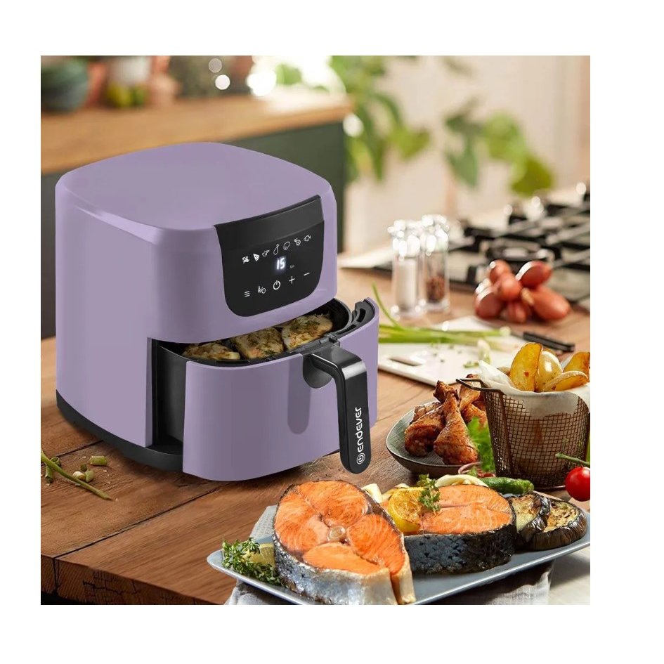 Аэрогриль оснащен сенсорным управлением и имеет 7 автоматических программ, благодаря которым вы можете приготовить картофель фри, пиццу, куриные крылышки, куриные ножки, стейки, креветки и рыбу. А также при желании, Вы можете вручную изменить время и температуру приготовления, что делает устройство еще более удобным в использовании.