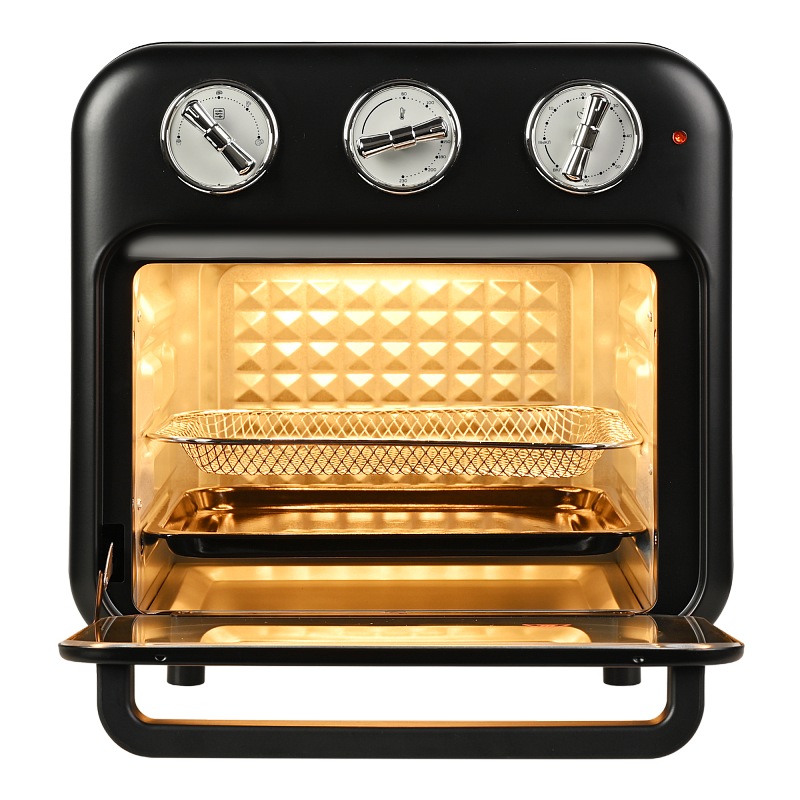 Многофункциональный аэрогриль печь c конвекцией GFAO-200 подойдет всем, кто не хочет тратить много времени на приготовление пищи, но при этом хочет питаться вкусно и полезно. Настольная мини печь электрическая имеет компактный размер (34,0*33,7*33,8 см) и стильный ретро дизайн, которые делают аэрогриль интересным предметом интерьера. Аэрофритюрница имеет объем внутренней камеры - 16 л, благодаря этому аэрогриль электрический GFAO-200 может стать полноценной альтернативой крупногабаритной духовки. В комплект аэрогриля входят противень, решетка для запекания и корзина для фритюра. Такое многообразие аксессуаров позволит не только запекать блюда, но и приготовить шашлыки, картофель фри и множество других блюд.Электропечь-аэрогриль поможет Вам выпекать, запекать, томить, тушить, сушить овощи и фрукты при помощи программы «Дегидратор», а также готовить во фритюре без масла. Галогеновый нагревательный элемент мощностью 1400 Вт обеспечивает быстрый нагрев до 230°C, а аэрогриль с мощным вентилятором позволит Вашим блюдам быстро и равномерно приготовиться со всех сторон. Вы с легкостью можете выбрать один из 5 режимов приготовления. При помощи удобных поворотных переключателей можно просто настроить нужное время и температуру приготовления. Духовка электрическая настольная выполнена в стильном дизайне с элементами под ретро. Встроенная внутренняя подсветка позволяет наблюдать за приготовлением, не открывая дверцу и не прерывая процесса. Звуковой сигнал оповестит о завершении процесса приготовления.АртикулGFAO-200ТипМини-печь с аэрогрилемМощность, Вт1400КомплектацияМини-печь, Противень, Корзина для жарки, РешеткаРазмеры, мм340х337х338Вес товара, кг4,7Цвет товараЧерныйАвтопрограммыНетОбъём, л16Таймер, минДаТип управленияМеханическоеМакс. температура, °С230