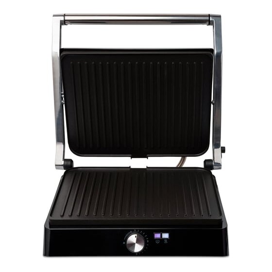 Электрогриль оснащён термостатом для поддержания постоянной температуры панелей и индикаторами, показывающими наличие питания, а также включение и отключение нагрева.