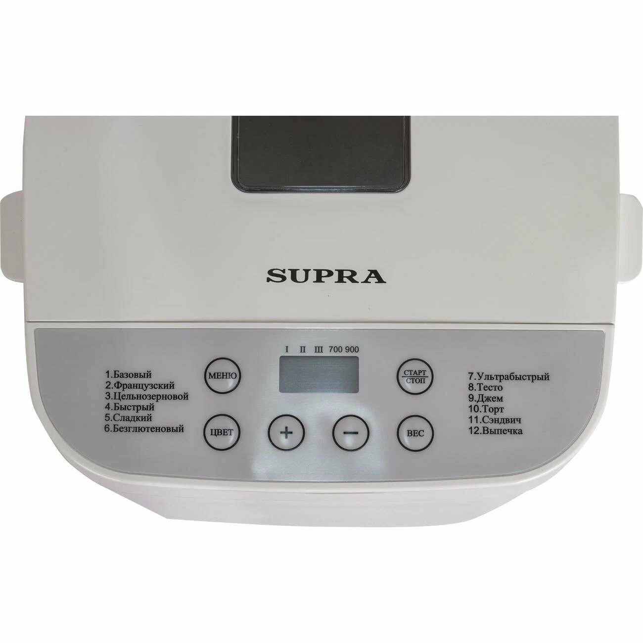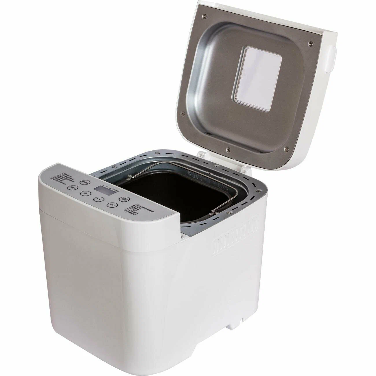 Отложенный старт; Поддержание температуры после выпекания; Индикация включениявремени приготовления; Прорезиненные ножки; Дисплей; Съемная форма; Звуковой сигнал; Окно контроля процесса; Сохранение программы при сбое электропитания; Отключение звукового сигнала; Программы хлебопечения: безглютеновый хлеб/безглютеновый кекс/ржаной хлеб/бородинский хлеб; Программы приготовления: тесто/варенье/кекс; Дополнительно в комплекте: мерный стакан, мерная ложка