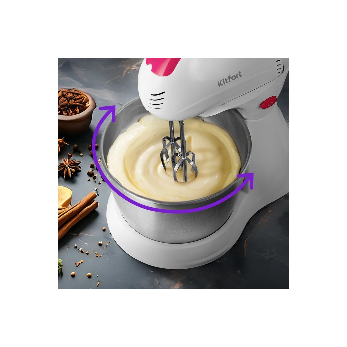 Во время работы насадки вращаются вокруг своей оси, а чашу можно вращать вручную, чтобы ингредиенты смешивались без комочков. Миксер может работать и в полностью автоматическом режиме без вращения чаши. Вам достаточно только установить насадки, положить ингредиенты в чашу и включить прибор. Это освободит вас от участия в процессе взбивания и перемешивания, а также позволит добавлять ингредиенты в чашу прямо в процессе смешивания. При этом КТ-3485 легко превращается в обычный ручной миксер, если снять его с подставки.
