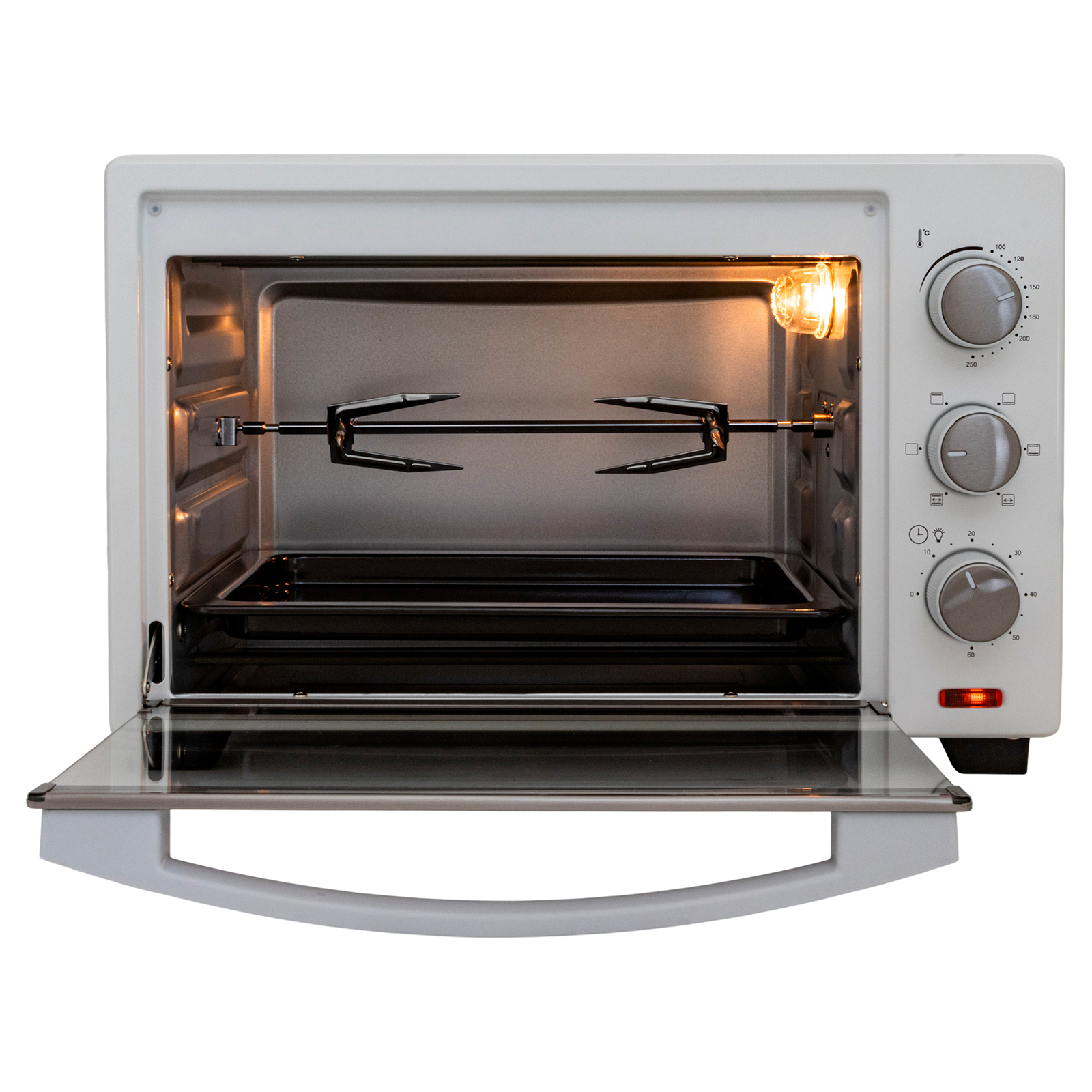 электропечь, металлическая решетка, плоский противень, круглая форма для пиццы, ухват для противня, вертел, ухват для вертела, инструкция на русском языке