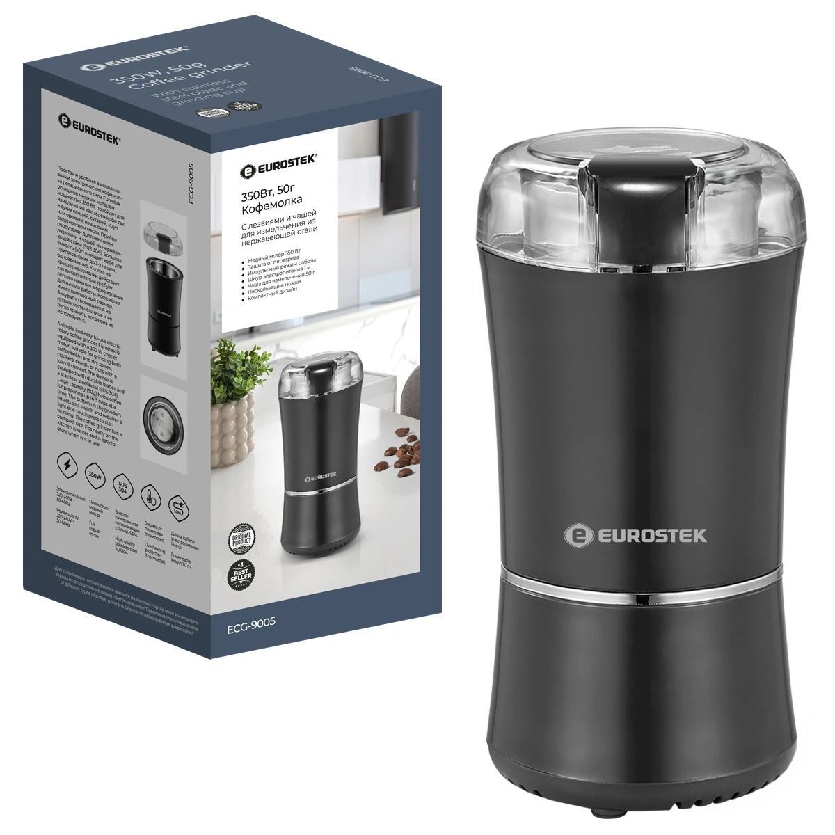 Кофемолка ECG-9005 проста и удобна в использовании. Подойдет для измельчения как зерен кофе так и сухих специй, сухарей, круп. мощность 350 Вт, объем 50 гр.