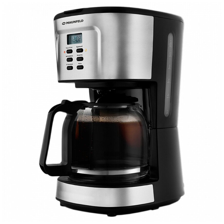 вращающийся фильтродержатель, индикатор уровня воды, индикатор включения, плита автоподогрева, дисплей