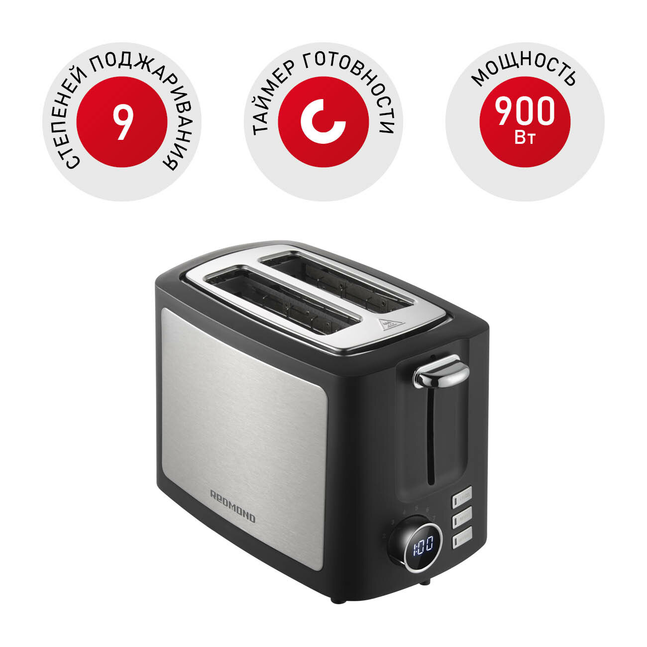 Дополнительные функции: автоматическое поднятие тостов, автоматическое центрирование тостов, кнопка отмены, регулировка степени обжаривания