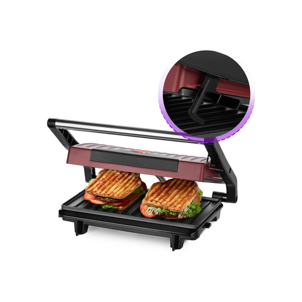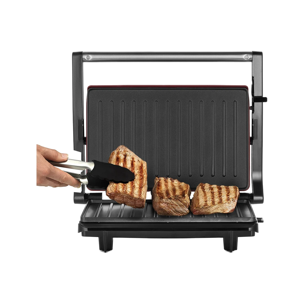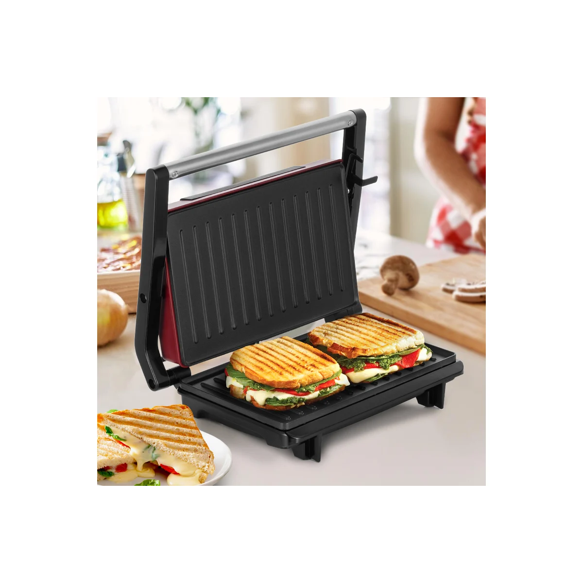 Технические характеристикиЦветчерный/красныйМатериал корпусанержавеющая сталь/пластикСъемные пластинынетРазмер рабочей поверхности230х145 ммАнтипригарное покрытиедаНагревательный элементзакрытыйРасположение нагревательного элементасверху и снизуОткрытие на 180°/положение барбекюнетРегулировка температурынетМощность750 ВтАвтоматическое отключениенетРучка с защитой от нагреваниядаУправление со смартфонанетПриложение для управлениянетГолосовой помощникнетДисплейнетТаймер обратного отсчетанетИндикатор нагревадаЛоток для жира и соканетГабариты без упаковки279х218x86 ммВес нетто1.3 кг