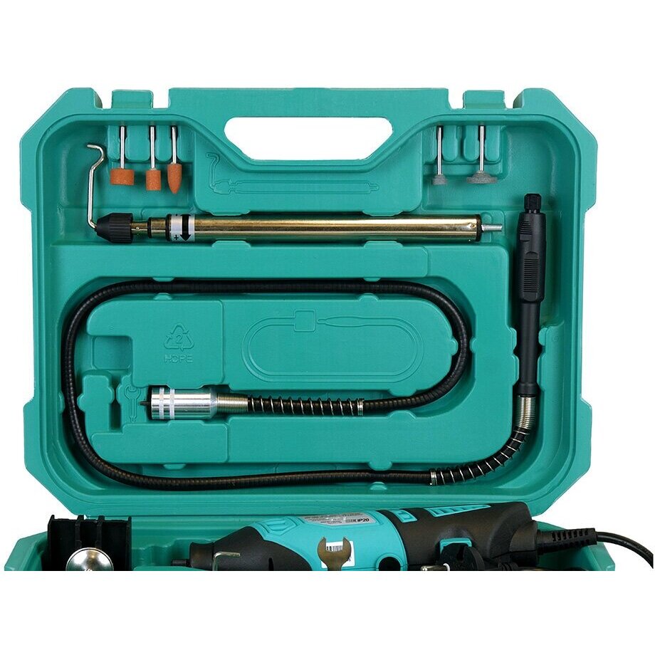 Хорошая эргономика корпуса с противоскользящими накладками дополняется наличием вспомогательной рукоятки для хвата при выполнении деликатных работ и стойки для подвешивания гравера с помощью складной скобы при работе с использованием гибкого вала.