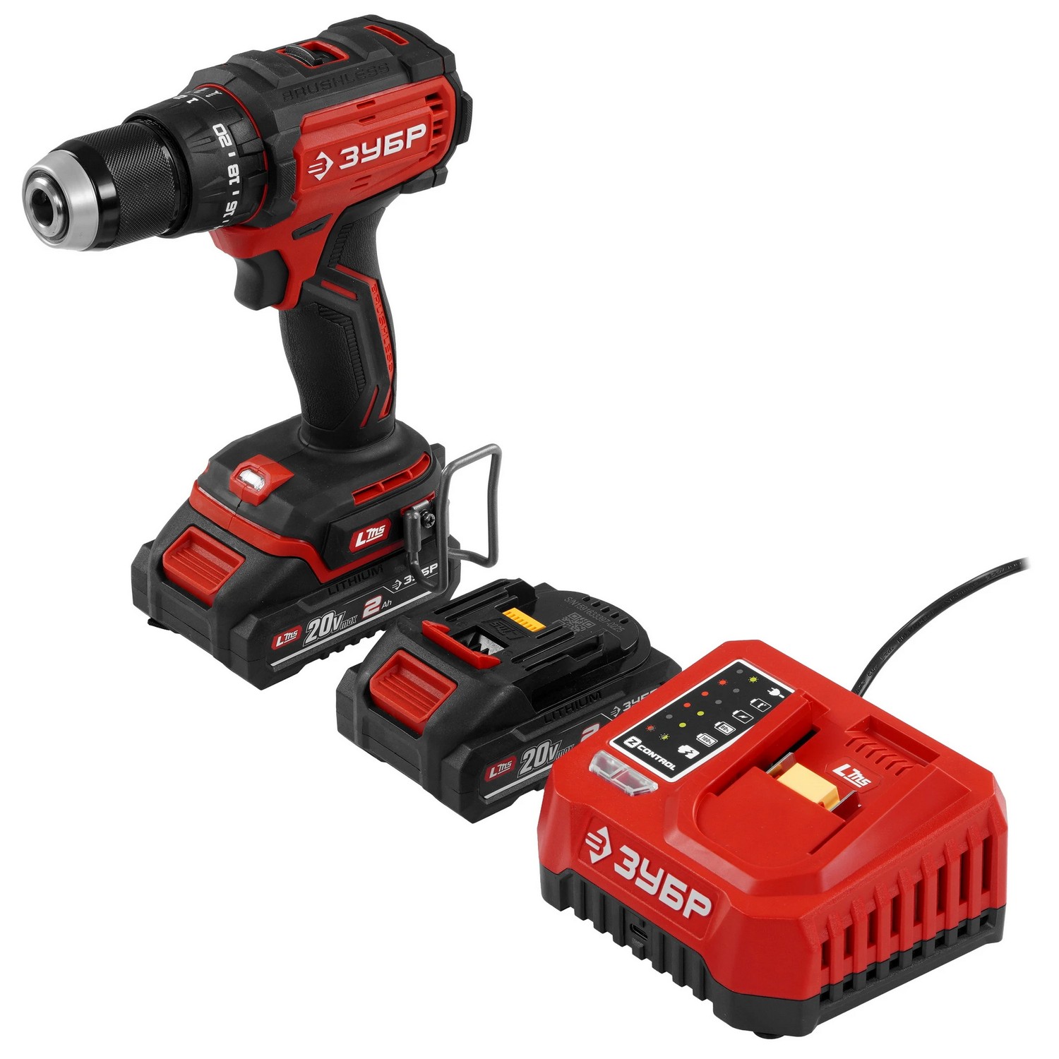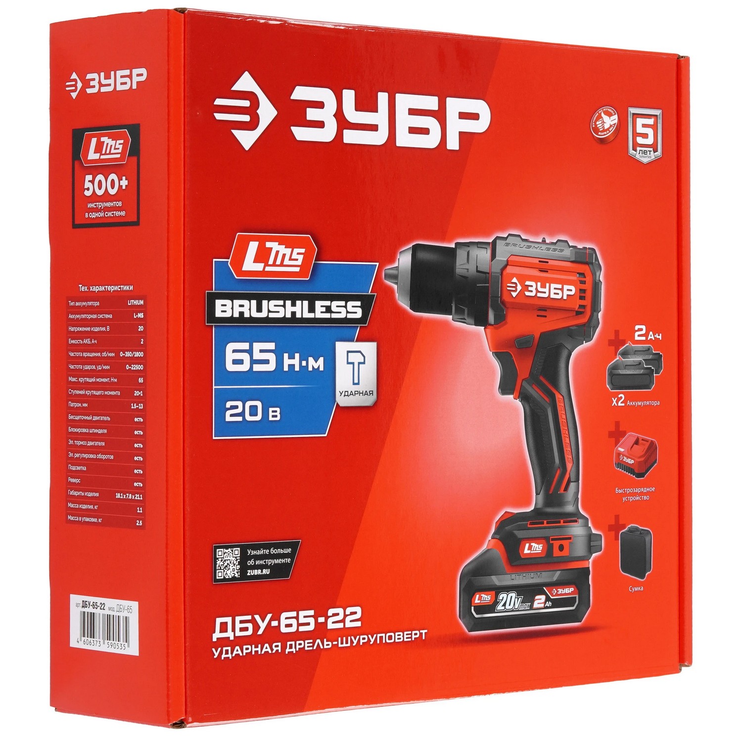 ЗУБР 20 В, 65 Н·м, 2 АКБ LMS (2 А·ч), бесщеточная ударная дрель-шуруповерт, сумка ДБУ-65-22 - бесщеточная дрель-шуруповерт ЗУБР системы LMS с увеличенным крутящим моментом предназначена для быстрого заворачивания саморезов до 8 мм диаметром и сверления отверстий до 30 мм в дереве. Длительная работа от одного заряда обеспечивается эффективным двигателем BRUSHLESS. Расширенная функциональность за счет ударного режима работы. Комплектация с двумя аккумуляторами позволяет работать практически без остановки.
