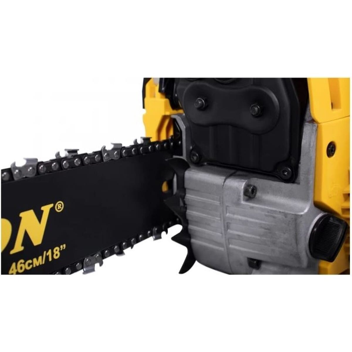 Бензопила оборудована системой виброгашения и всеми необходимыми системами безопасности, такими как центробежный тормоз цепи и цепеуловитель.