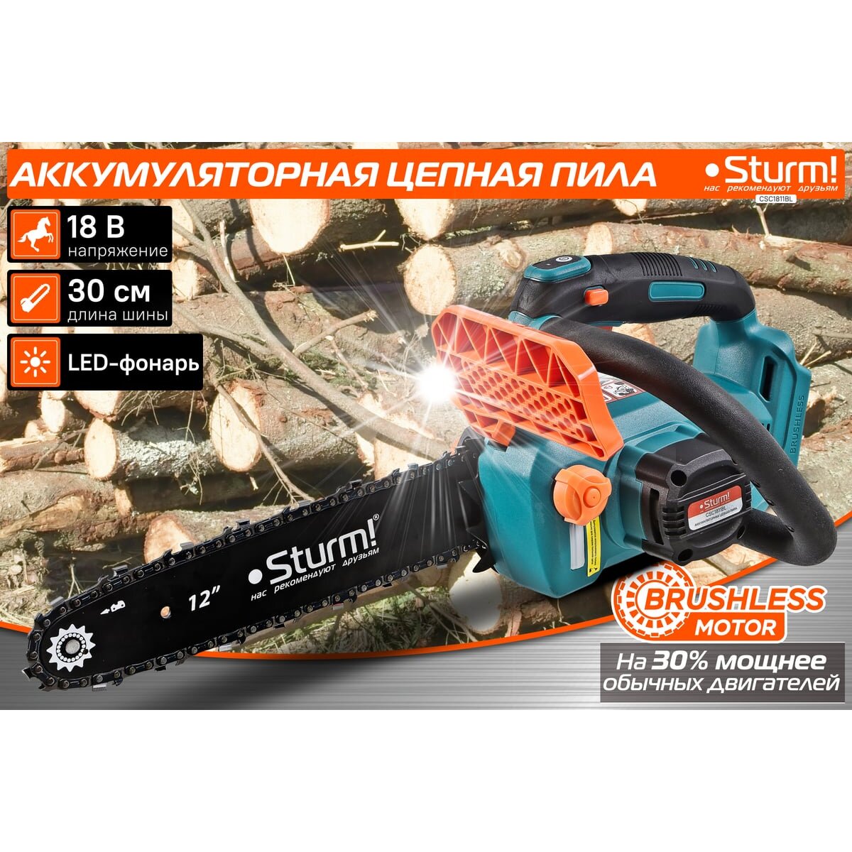 Пила цепная аккумуляторная б/щ Sturm!, CSC1811BL 18В, 1BatterySystem, шина 30 см, без АКБ и ЗУ