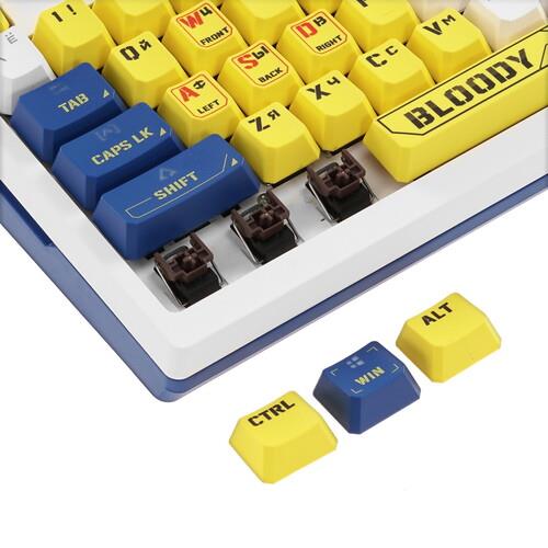 Клавиатура Bloody B950 [1975318] выполнена в бело-синем корпусе. Модель примечательна комбинированной расцветкой кейкапов. На основании расположены выдвижные ножки для регулировки угла наклона. Подключение к компьютеру выполняется по кабелю с интерфейсом USB.