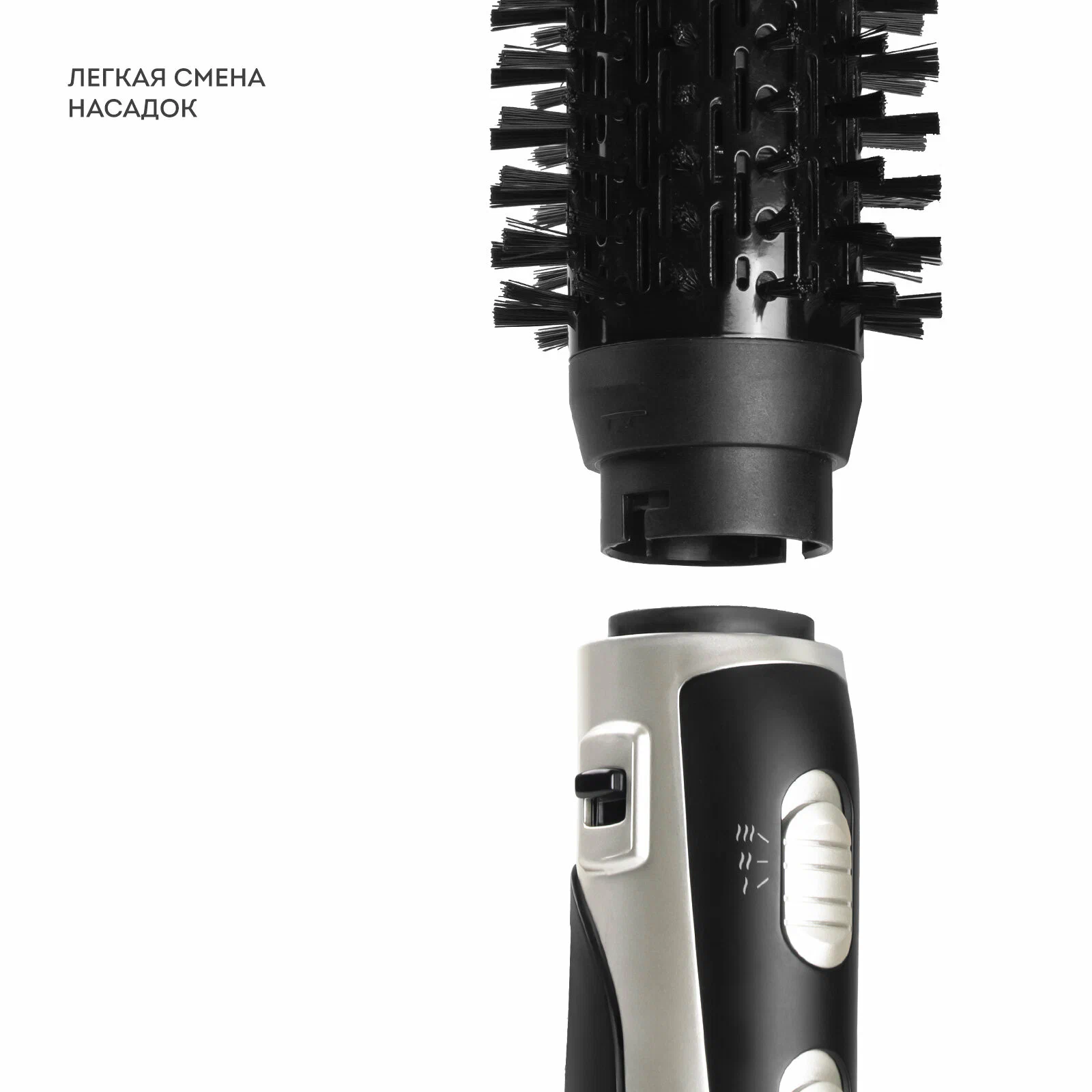Насадка круглая со щетиной предназначена для закручивания локонов внутрь/наружу и придания объема у корней. Полая насадка-расческа предназначена для сушки волос. Полукруглая насадка-щетка предназначена для одновременной сушки и расчесывания волос.
