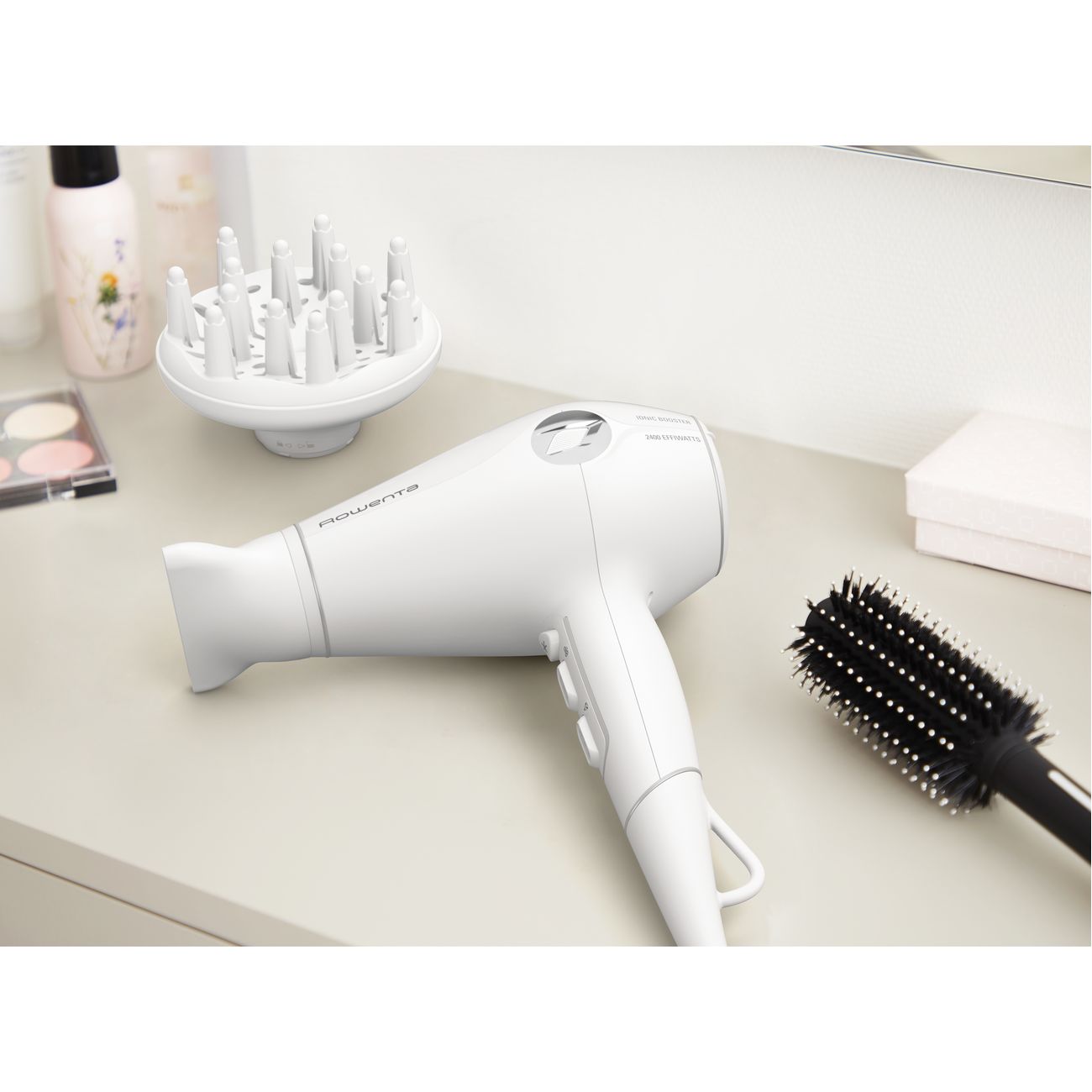 Фен Rowenta – это сочетание компактности, удобства использования и высокой мощности. Гибридный мотор и особая конструкция вентилятора позволили значительно увеличить силу потока. С его помощью вы быстро высушите и уложите волосы любой длины, а также придадите им эффектный прикорневой объём.