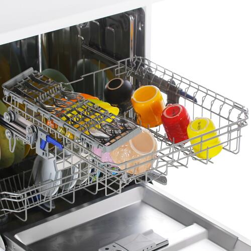 Посудомоечная машина MAUNFELD MWF12S выполнена в белом корпусе стандартного размера 84.5x59.8x60 см. Она содержит две корзины и рассчитана на загрузку 12 комплектов посуды. Для размещения большой посуды скобы можно складывать, а также регулировать среднюю корзину по высоте. Аппарат при полной загрузке расходует 11.5 л воды. Безопасную эксплуатацию обеспечивает полная защита от протечек, которая реализуется через корпус и шланг.