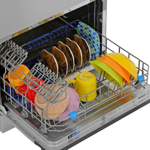 Посудомоечная машина Midea MCFD55S460Si с размерами 55x50x43.8 см предусматривает размещение на столе. Она оснащена 7 автоматическими программами с разной продолжительностью цикла и температурой нагрева воды. Выдвижная корзина вмешает 6 комплектов посуды. Антибактериальный фильтр предотвращает размножение бактерий и микроорганизмов.
