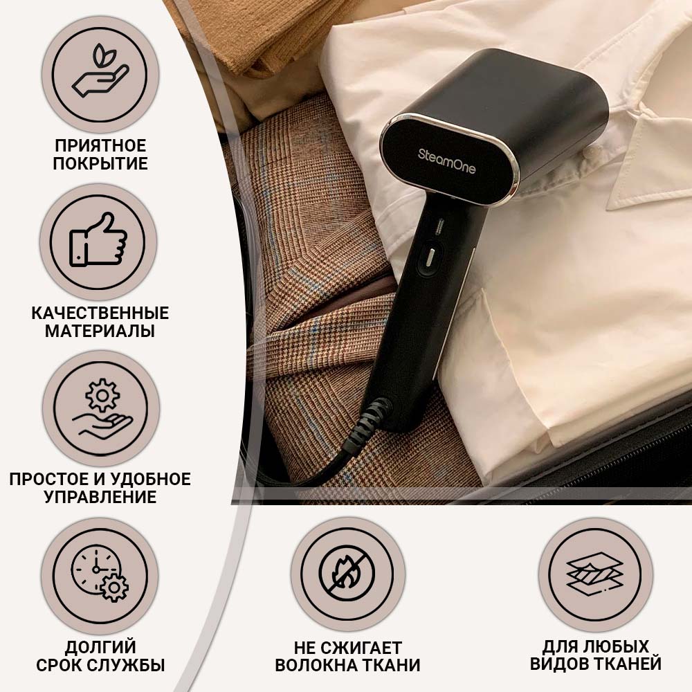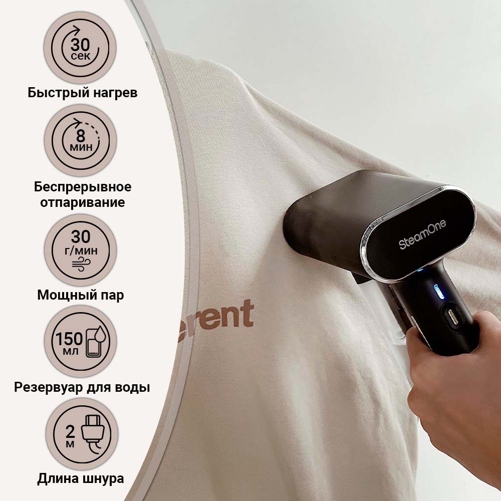 Ручной отпариватель SteamOne EUNS150B компактный, но при этом очень мощный помощник. Благодаря мощному потоку пара 30 г/мин он с лёгкостью разглаживает заломы на любой ткани. За 30 секунд отпариватель нагревается до нужной температуры и способен работать беспрерывно на протяжении 8 минут. Небольшой размер делает устройство очень мобильным и удобным для транспортировки.