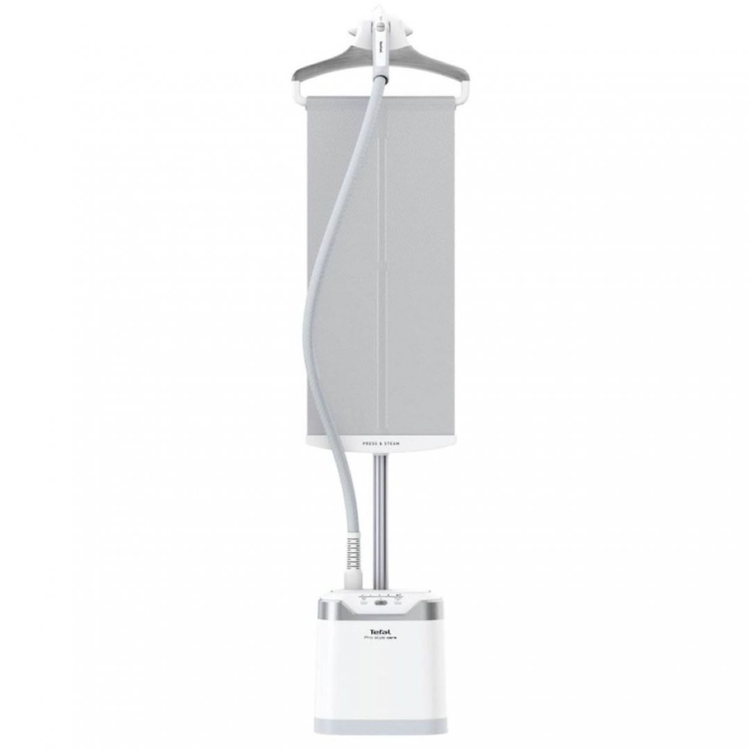 Вертикальный отпариватель Tefal IT8470E1 оснащен вертикальной гладильной доской. Это создает дополнительный упор во время обработки вещей и улучшает результат. Для фиксации одежды в устройстве предусмотрена вешалка. Использование термостойкой рукавицы помогает избежать ожога. Высота телескопической стойки регулируется с учетом предпочтений. Подошва утюга изготовлена из нержавеющей стали. Встроенные индикаторы оповещают об активации, готовности к работе и наличии воды.
