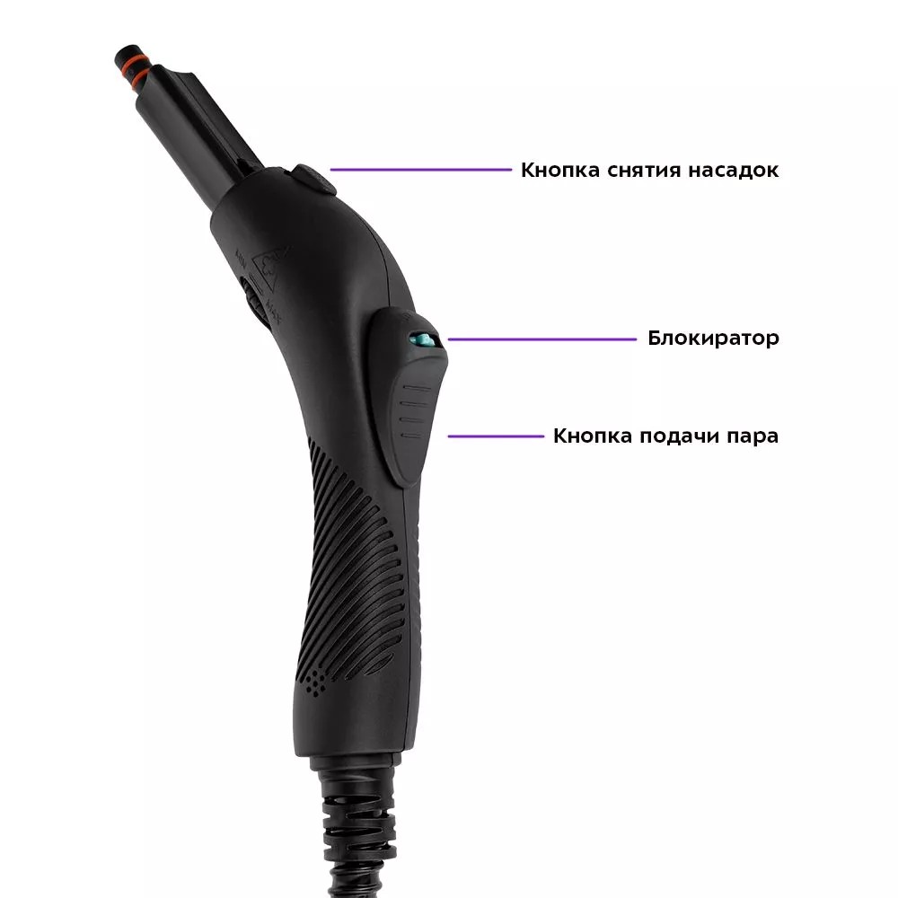 Чтобы начать подачу пара, необходимо зажать кнопку подачи пара на паровом пистолете. Блокиратор фиксирует кнопку в нажатом или не нажатом положении. Зажмите кнопку подачи пара, сдвиньте блокиратор вправо. Теперь кнопка подачи пара зафиксирована.