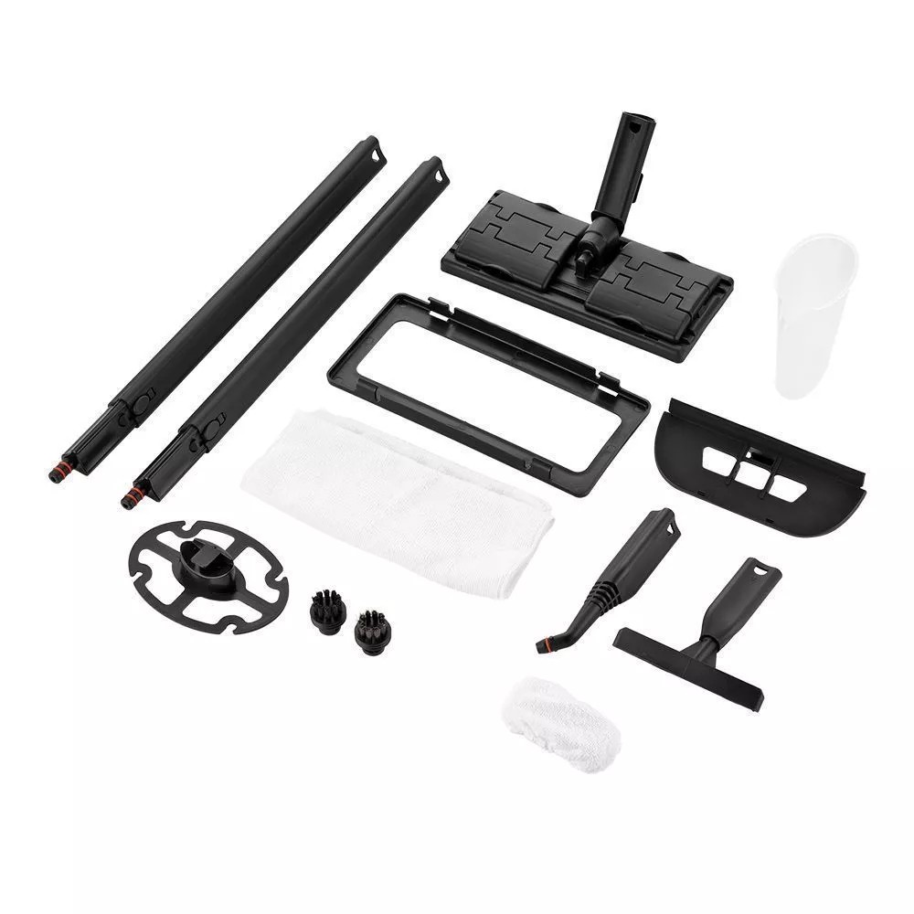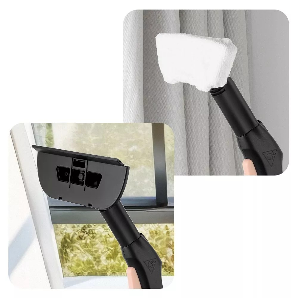 Если установить насадку с резиновым скребком, то можно очистить любые гладкие поверхности вроде окон или зеркал. С надетой на насадку тряпкой можно отпаривать ткани и обивки мягкой мебели.