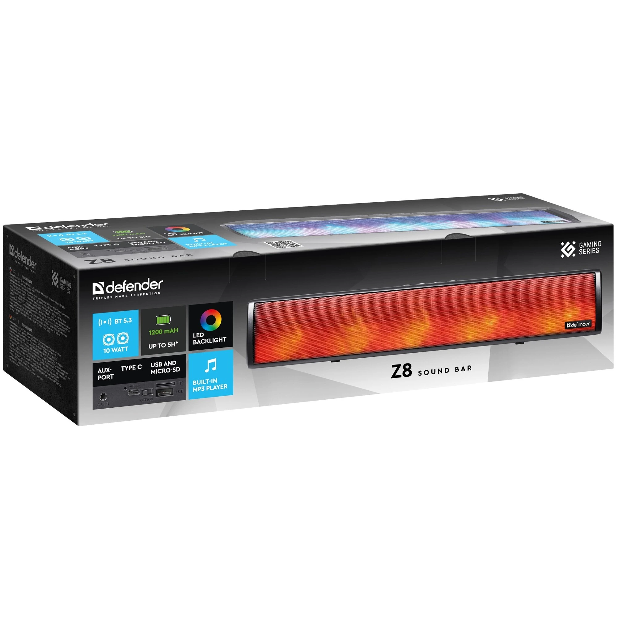 Defender Z8 - портативная колонка-саундбар с функцией Bluetooth. Универсальное устройство подходит для ПК, телевизора и для использования вне дома. Встроенный аккумулятор ёмкостью 1200 мАч позволяет использовать динамик без привязки к источнику питания. Красивая подсветка по всей передней панели, потрясающее качество звука для ваших любимых фильмов и музыки дома или в путешествии.