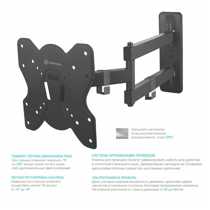 Дополнительная информация: угол наклона: -8° - +8°; угол поворота: 180°; вылет от стены: 65 мм - 448 мм; материал: холоднокатаная сталь (SPCC class)