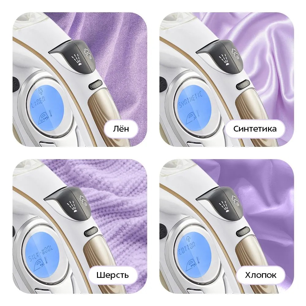 Всего прибор имеет 4 уровня нагрева, которые подойдут для синтетики, шёлка и шерсти, хлопка и даже льна. Включённый режим отображается на дисплее под ручкой прибора.