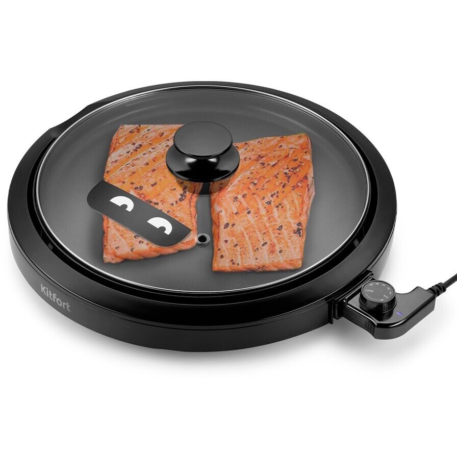 Гриль накрывается крышкой из закалённого стекла, через которую можно наблюдать за процессом приготовления. На крышке расположена удобная ручка, она не нагревается. При закрытой крышке приготовление проходит ещё более эффективно.