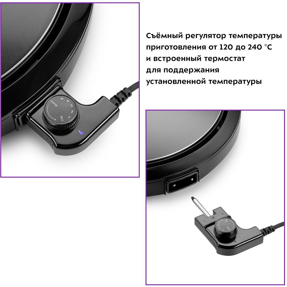 Электрогриль оснащён термостатом для поддержания установленной температуры панели и индикатором, сообщающим о включении и отключении нагрева. Регулятором можно установить один из 5 температурных режимов от 120 до 240 °С.