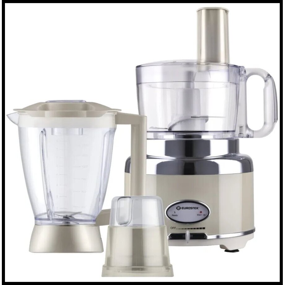 Кухонный комбайн "Eurostek" EFP-2079. Максимальная мощность 800Вт; металлический корпус, плавная регулировка скорости; измельчитель 1.2л., блендер 1.75л., кофемолка. Стальные лезвия измельчителя; диски для размягчения, получения эмульсий. Нарезка тонкими ломтиками, шинковка, приготовление жульена, картофельная терка - с 4-мя вставками.