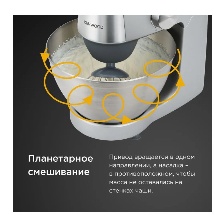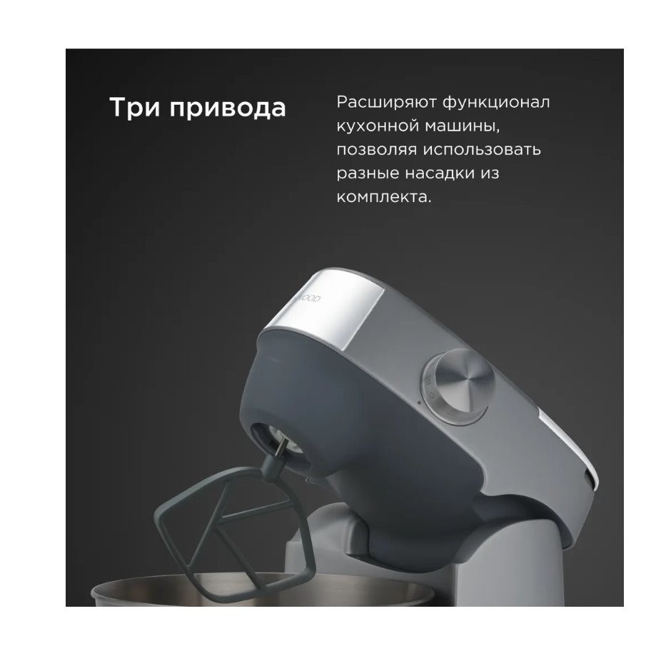 Два привода расположены в передней части, один сверху в корпусе. Первые предназначены для подключения таких насадок как венчик, крюк-тестомес и фирменная К-насадка. Верхний же привод позволяет подключать цитрус-пресс. Обратите внимание, что основной передний привод работает по "планетарному" принципу. Насадки, подключенные к нему, вращаются независимо от самого основного блока, который по сложной траектории плавно перемещается внутри чаши. Такая особая схема обеспечивает идеальное качество смешивания и полностью исключает необходимость в ручной работе.