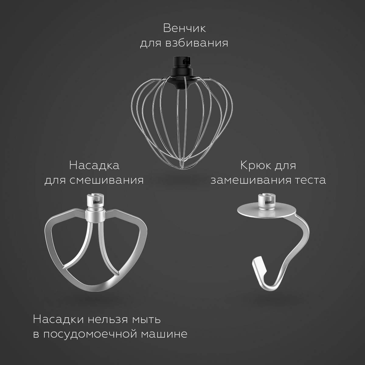 Планетарный миксер, чаша, защитная крышка от брызг, металлический венчик для взбивания, крюк для замешивания теста, насадка для смешивания, инструкция по эксплуатации, гарантийный талон