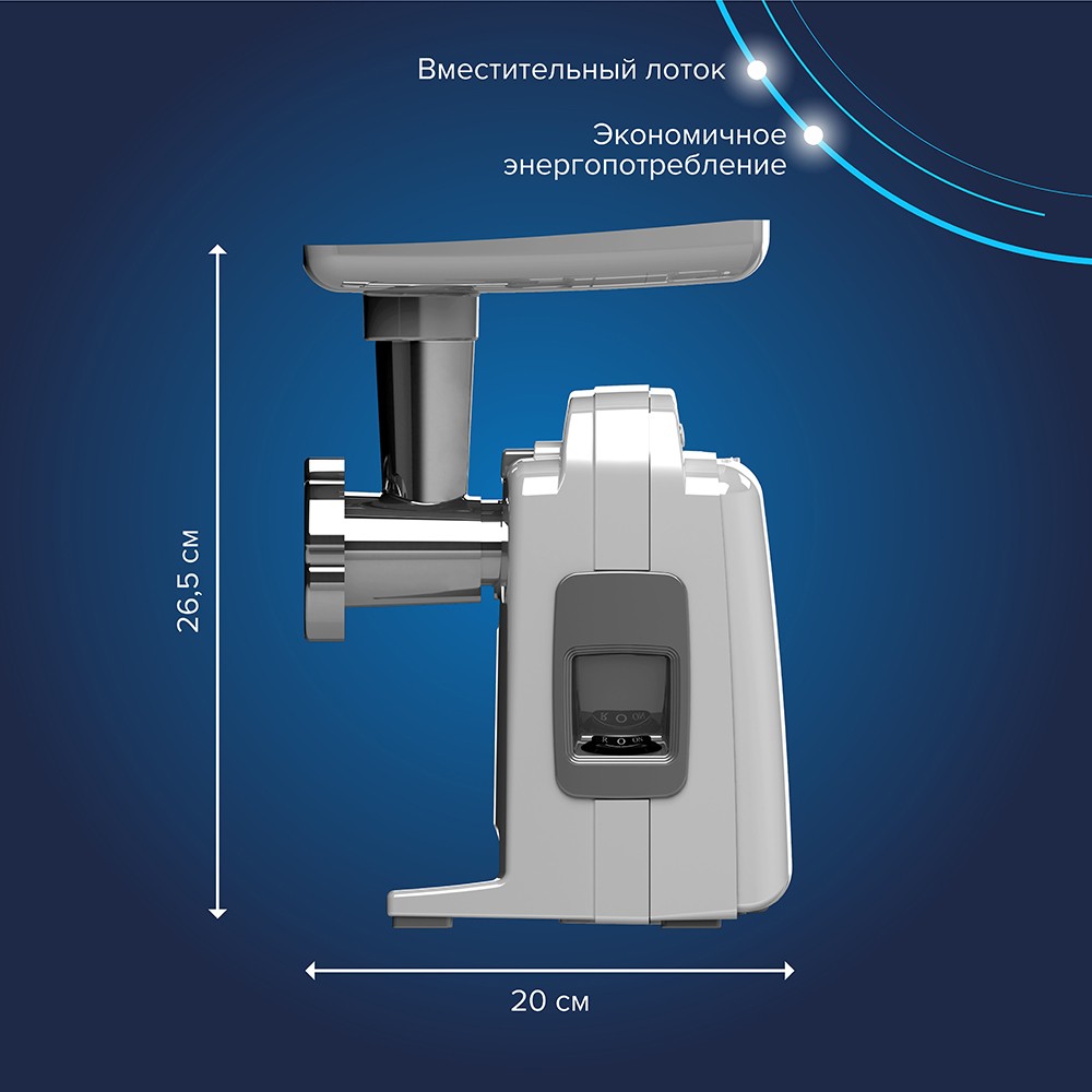 Высокое размещение шнековой камеры дает возможность использовать глубокую посуду для фарша
